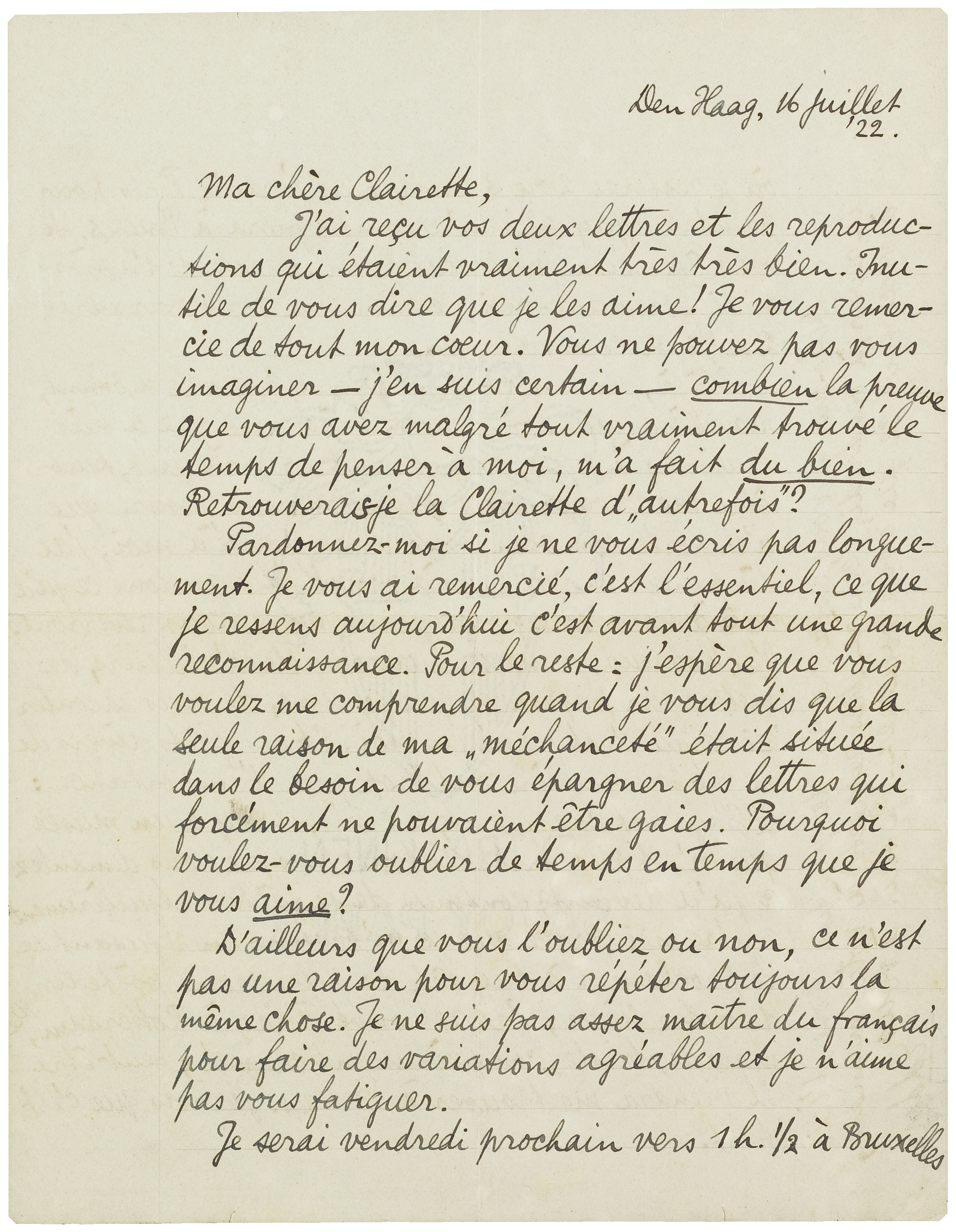 Voilà, contentez-vous de ceci pour le moment, ma chère amie. Vous savez très bien que je suis toujours à vous, toujours et tout-à-fait, peut-être me croirez-vous quand je vous assure que n'importe combien vous avez pensé à moi, j'ai dû penser encore plus à vous! Mais gardons ce qu'il reste à nous dire pour quand nous nous reverrons. J'ai horreur, je me sens incapable d'ailleurs, de mettre sur papier ce que je sens, de vous raconter ici ce qui s'est passé en moi. Et les faits divers de la vie journalière ont trop peu d'importance: la Haye est charmante, je crois, il y a un musée qui n'est pas mal, Anton (puisque vous demandez ce qu'il devient) continue de se fâcher régulièrement contre moi parce que je m'obstine en refusant de le proclamer à tue-tête le plus grand poète lyrique de notre siècle; j'ai retrouvé Ferdy à Rotterdam, malade, triste, complètement changé; peut-être il viendra me trouver à Bruges. Je crois que c'est tout.