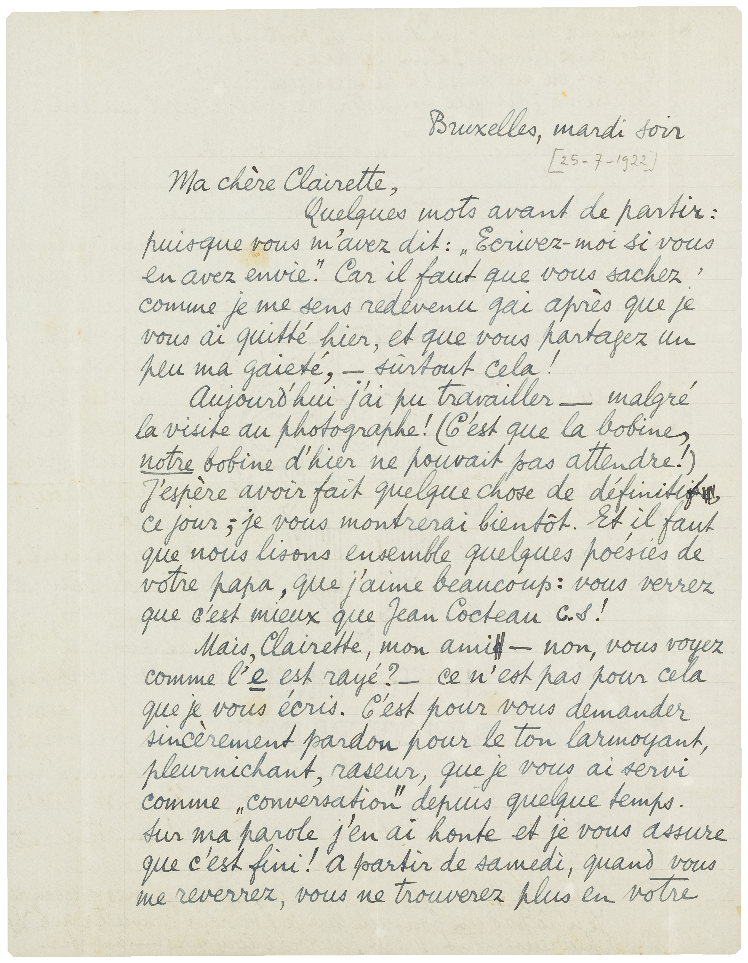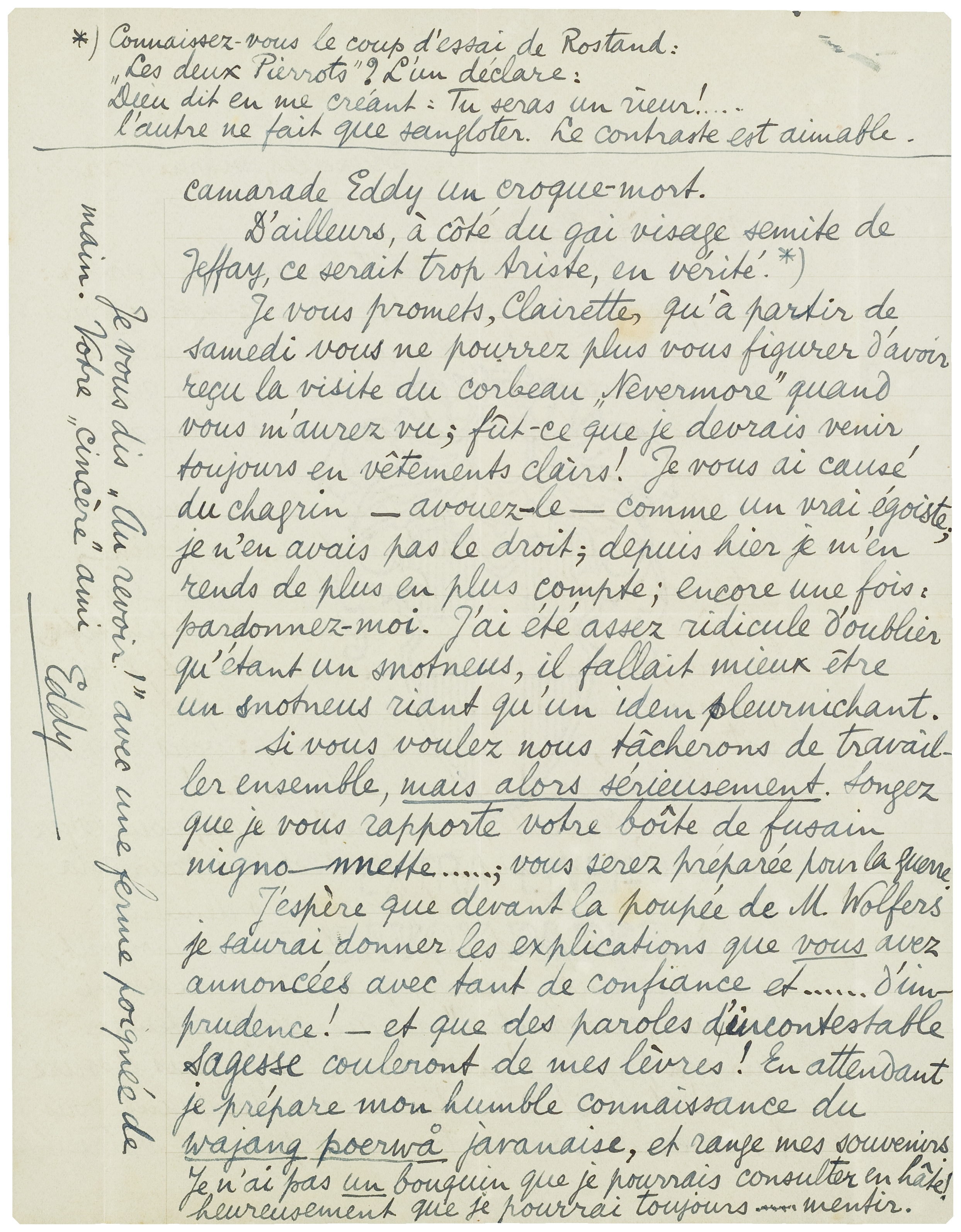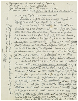 Mais, Clairette, mon ami - non, vous voyez comme l'e est rayé? - ce n'est pas pour cela que je vous écris. C'est pour vous demander sincèrement pardon pour le ton larmoyant, pleurnichant, raseur, que je vous ai servi comme ‘conversation’ depuis quelques temps. Sur ma parole j'en ai honte et je vous assure que c'est fini! A partir de samedi, quand vous me reverrez, vous ne trouverez plus en votre camarade Eddy un croque-mort.