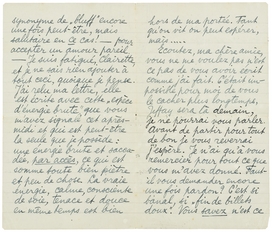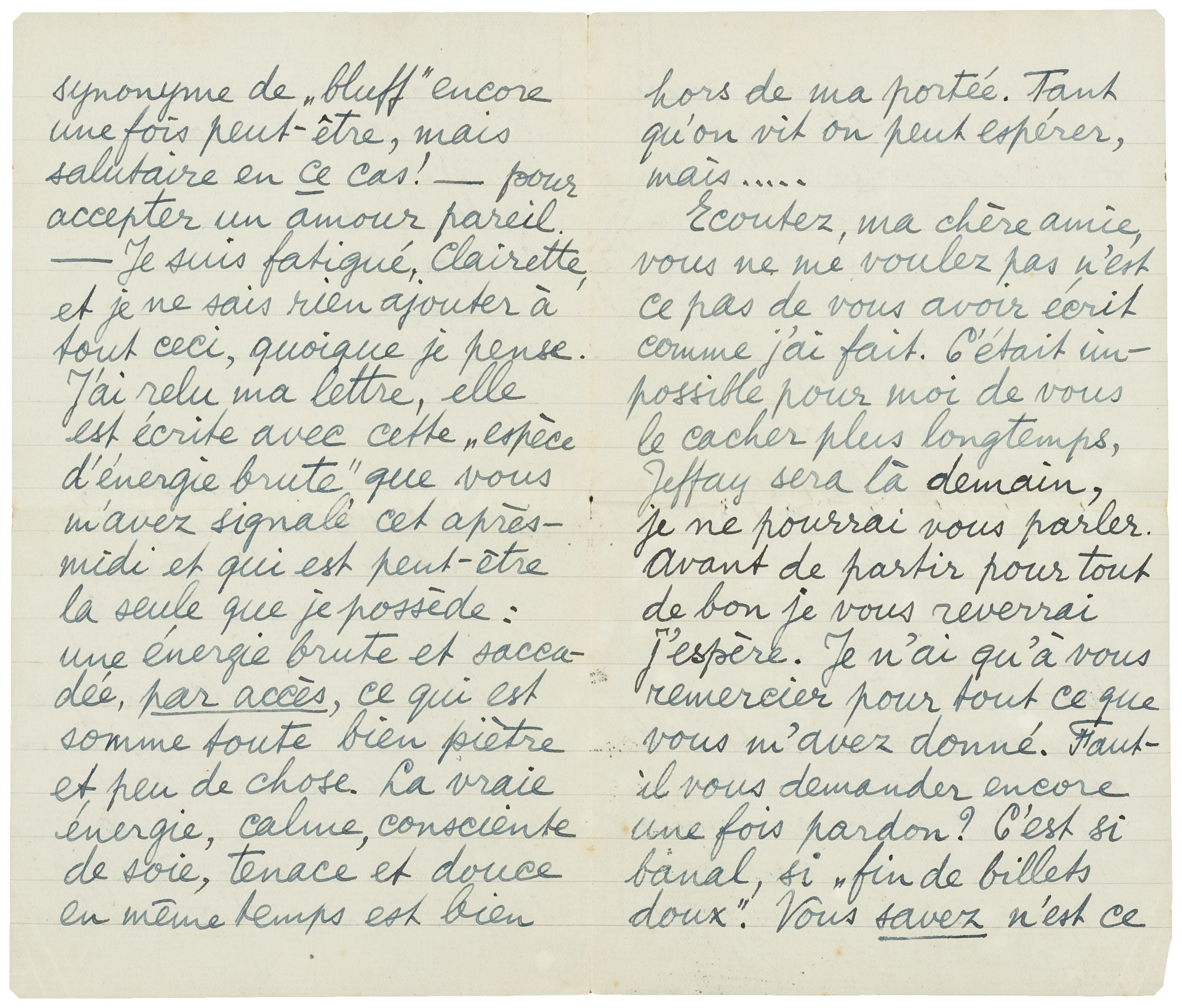 Ecoutez, ma chère amie, vous ne me voulez pas n'est ce pas de vous avoir écrit comme j'ai fait. C'était impossible pour moi de vous le cacher plus longtemps, Jeffay sera là demain, je ne pourrai vous parler. Avant de partir pour tout de bon je vous reverrai j'espère. Je n'ai qu'à vous remercier pour tout ce que vous m'avez donné. Faut-il vous demander encore une fois pardon? C'est si banal, si ‘fin de billets doux’. Vous savez n'est ce pas que je n'ai pas voulu vous blesser, car je vous admire et vous aime.