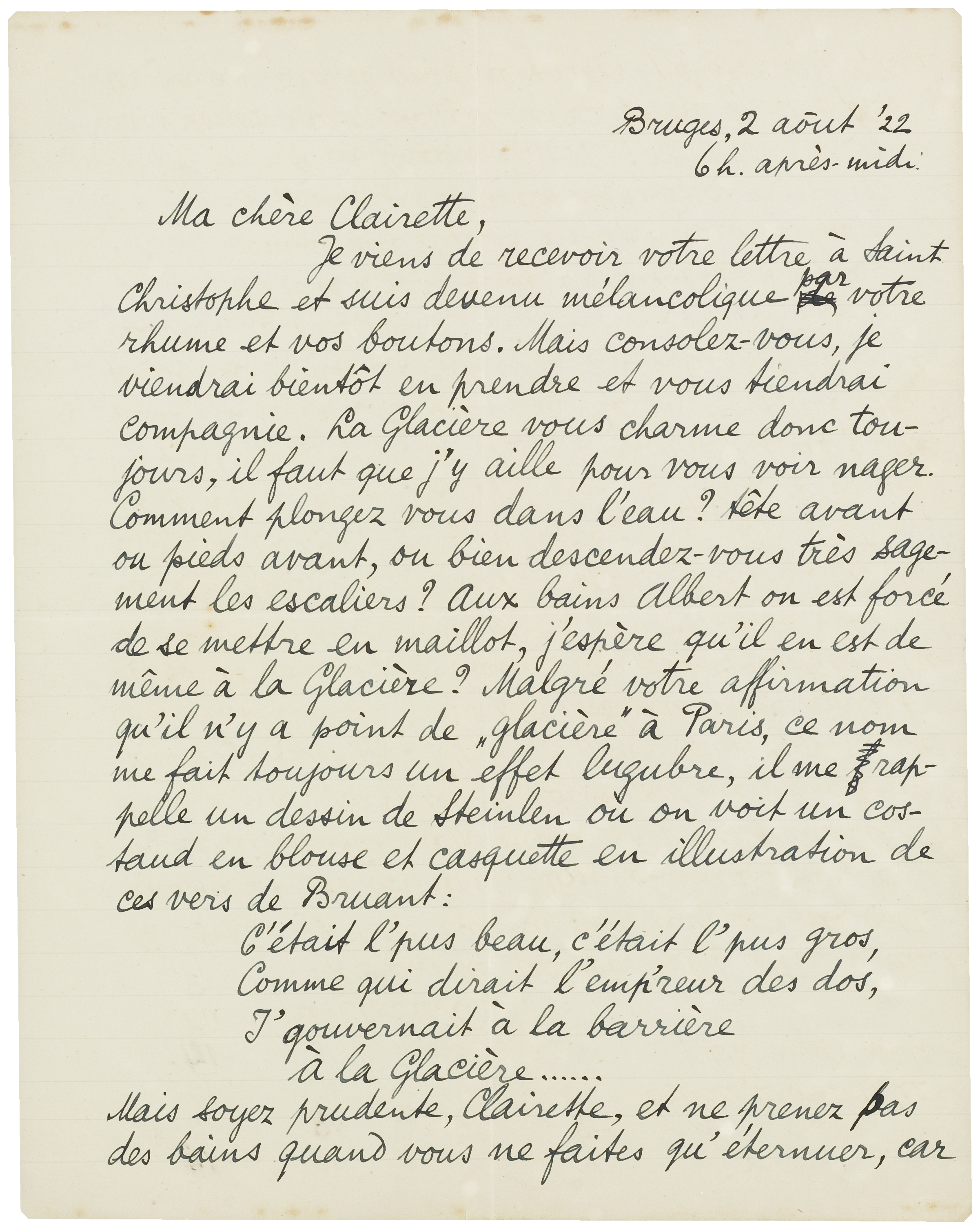 Je viens de recevoir votre lettre à Saint Christophe et suis devenu mélancolique par votre rhume et vos boutons. Mais consolez-vous, je viendrai bientôt en prendre et vous tiendrai compagnie. La Glacière vous charme donc toujours, il faut que j'y aille pour vous voir nager. Comment plongez-vous dans l'eau? tête avant ou pieds avant, ou bien descendez-vous très sagement les escaliers? Aux bains Albert on est forcé de se mettre en maillot, j'espère qu'il en est de même à la Glacière? Malgré votre affirmation qu'il n'y a point de ‘glacière’ à Paris, ce nom me fait toujours un effet lugubre, il me rappelle un dessin de Steinlen où on voit un costaud en blouse et casquette en illustration de ces vers de Bruant: