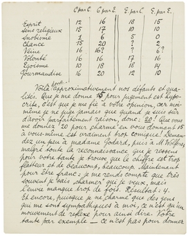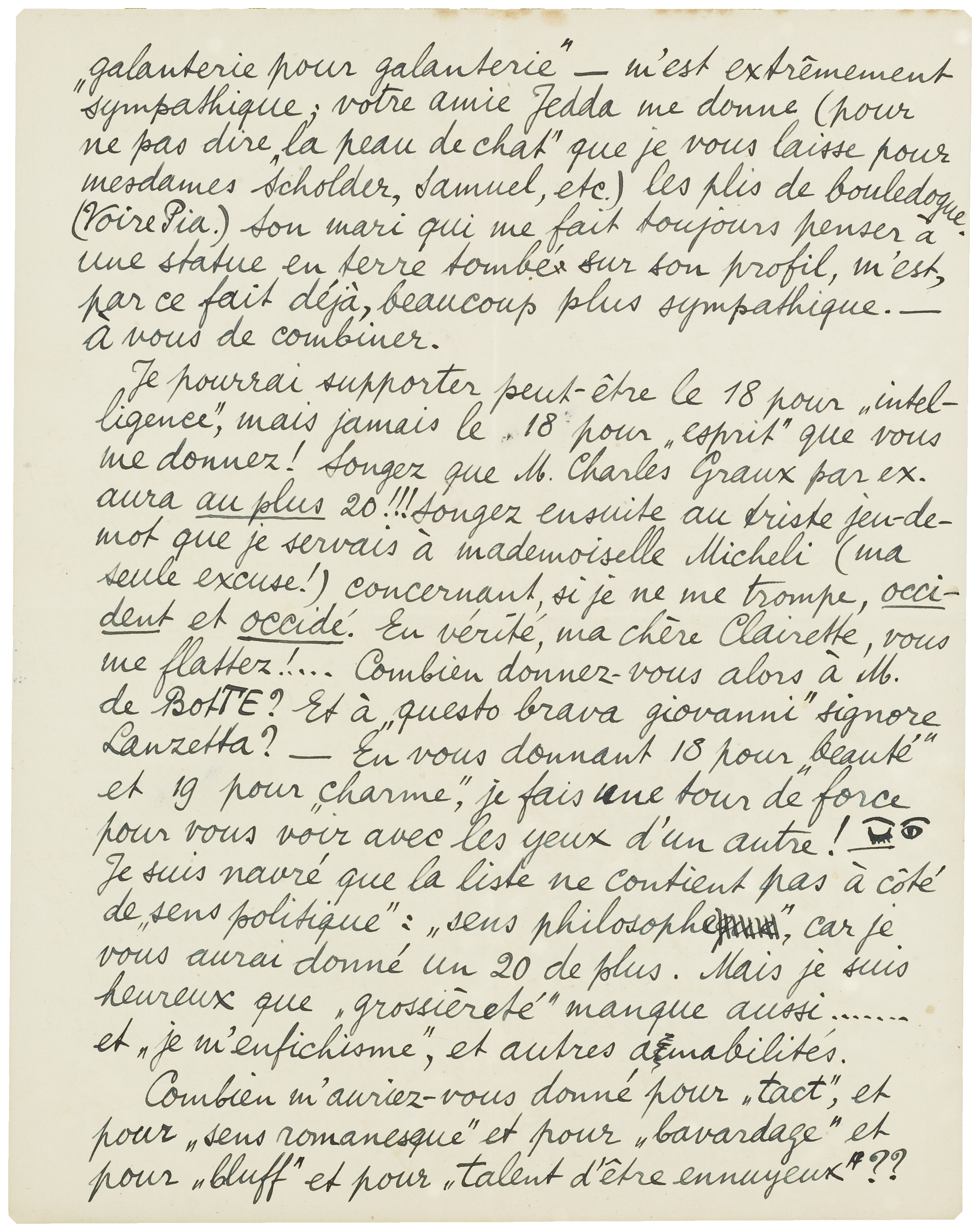 Voilà donc approximativement vos défauts et qualités. Que je me donne 15 pour jugement est hypocrite, c'est que je me fie à votre opinion, car moi-même je ne juge jamais que quand je suis sûr d'avoir parfaitement raison, donc: 20! Que vous me donnez 20 pour ‘charme’ en vous donnant 15 à vous-même est vraiment trop comique! Demandez un peu à madame Godard, puis à M. Wolfers; malgré toute la reconnaissance que je ressens pour votre tante je trouve que le chiffre est trop flatteur et de beaucoup, beaucoup. Maintenant pour être franc: je me rends compte que très souvent je sais ‘charmer’ qui je veux, mais l'envie manque trop de fois. Résultat: 4. Et encore, puisque je ne ‘charme’ que des gens qui me sont sympathiques à moi, ce n'est qu'un mouvement de reflexe pour ainsi dire. Votre tante par exemple - ce n'est pas pour donner ‘galanterie pour galanterie’ - m'est extrêmement sympathique; votre amie Jedda me donne (pour ne pas dire ‘la peau de chat’ que je vous laisse pour mesdames Scholder, Samuel, etc.) les plis de bouledogue (Voire Pia.) Son mari qui me fait toujours penser à une statue en terre tombé sur son profil, m'est, par ce fait déjà, beaucoup plus sympathique. - A vous de combiner.