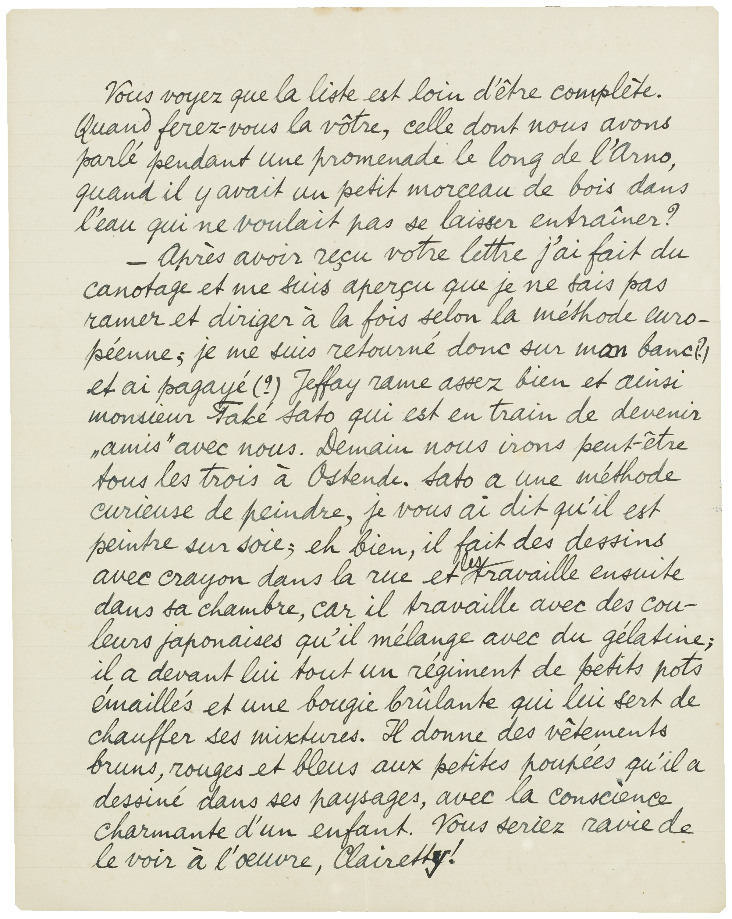 - Après avoir reçu votre lettre j'ai fait du canotage et me suis aperçu que je ne sais pas ramer et diriger à la fois selon la méthode européenne; je me suis retourné donc sur mon banc (?) et ai pagayé (?) Jeffay rame assez bien et ainsi monsieur Také Sato qui est en train de devenir ‘amis’ avec nous. Demain nous irons peut-être tous les trois à Ostende. Sato a une méthode curieuse de peindre, je vous ai dit qu'il est peintre sur soie; eh bien, il fait des dessins avec crayon dans la rue et les travaille ensuite dans sa chambre, car il travaille avec des couleurs japonaises qu'il mélange avec du gélatine; il a devant lui tout un régiment de petits pots émaillés et une bougie brûlante qui lui sert de chauffer ses mixtures. Il donne des vêtements bruns, rouges et bleus aux petites poupées qu'il a dessiné dans ses paysages, avec la conscience charmante d'un enfant. Vous seriez ravie de le voir à l'oeuvre, Clairetty!