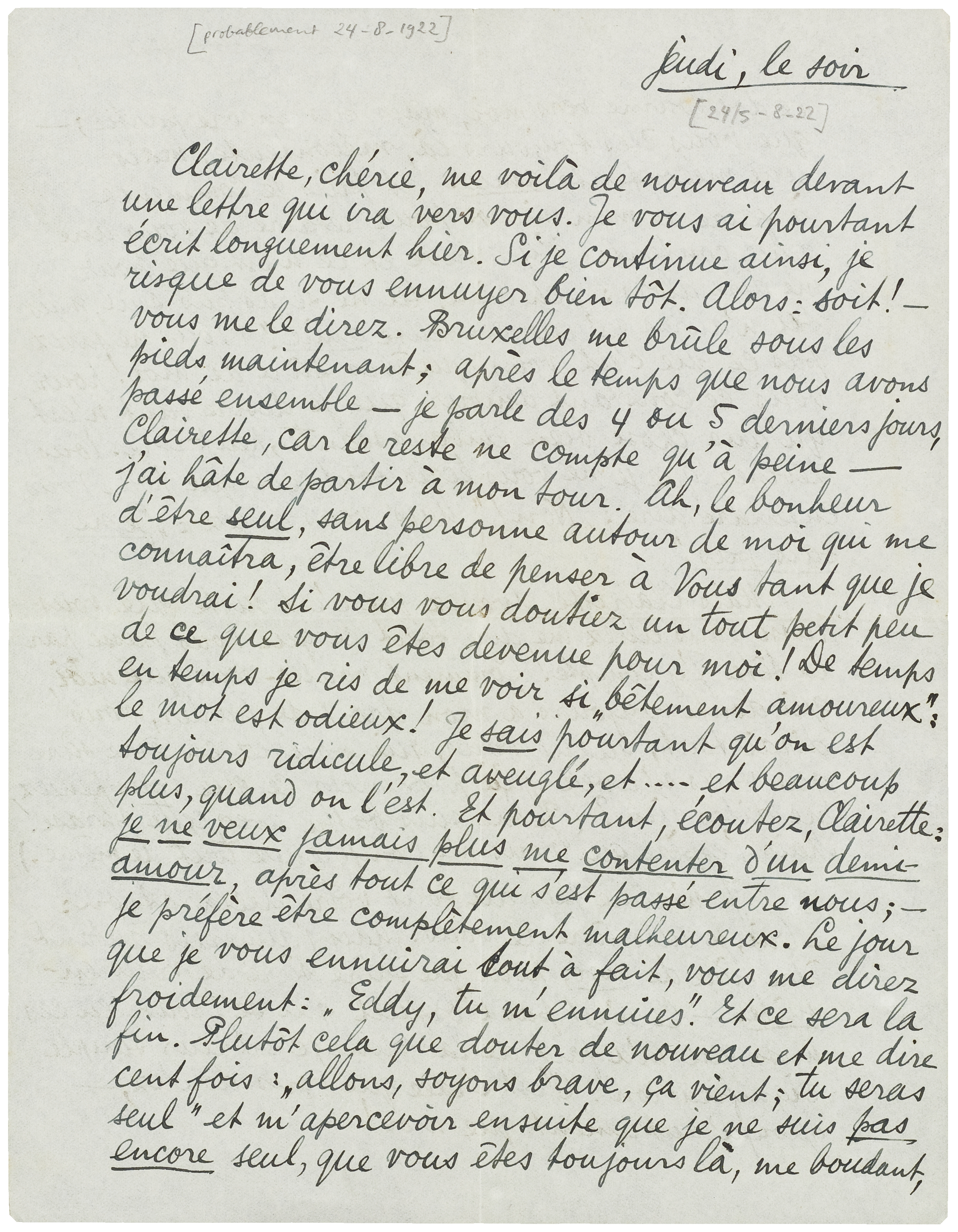 me voilà de nouveau devant une lettre qui va vers vous. Je vous ai pourtant écris longuement hier. Si je continue ainsi, je risque de vous ennuyer bien tôt. Alors: soit! - vous me le direz. Bruxelles me brûle sous les pieds maintenant; après le temps que nous avons passé ensemble - je parle des 4 ou 5 derniers jours, Clairette, car le reste ne compte qu'à peine - j'ai hâte de partir à mon tour. Ah, le bonheur d'être seul, sans personne autour de moi qui me connaîtra, être libre de penser à Vous tant que je le voudrai! Si vous vous doutiez un tout petit peu de ce que vous êtes devenue pour moi! De temps en temps je ris de me voir si ‘bêtement amoureux’: le mot est odieux! Je sais pourtant qu'on est toujours ridicule, et aveuglé, et.... et beaucoup plus, quand on l'est. Et pourtant, écoutez, Clairette, je ne veux jamais plus me contenter d'un demi-amour, après tout ce qui s'est passé entre nous; - je préfère être complètement malheureux. Le jour que je vous ennuirai tout à fait, vous me direz froidement: ‘Eddy, tu m'ennuies’. Et ce sera la fin. Plutôt cela que douter de nouveau et me dire cent fois: ‘allons, soyons brave, ça vient; tu seras seul’ et m'apercevoir ensuite que je ne suis pas encore seul, que vous êtes toujours là, me boudant, le dos tourné vers moi, mais pas encore partie;- que vous êtes toujours là, mécontente, mais une mécontente amie. Et puis je commence à faire de mon mieux pour refaire de vous une amie contente; j'y arrive et ce n'est que pour me dire alors: ‘eh bien, tu ne seras pas seul, mais tu n'auras qu'une contente amie.’ Vous ne savez pas ce que c'est, vous qui êtes sûre de moi! pour vous ce constant amour que je désire tant n'est qu'une chose bien embarassante, peut-être. Vous devinez que je ne vous écris tout ceci que pour vous entendre dire: ‘Non!’ Mais vous direz: ‘Je ne sais pas.’