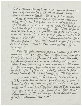Mais Clairette, avouez que c'est juste que vous aussi vous allez me dire tout ce qui vous passe par la tête. J'y compte! Comment voulez-vous que moi, qui doute toujours à mon droit de parler, vous dirai tout, quand vous, qui pouvez en être sûre que vous n'avez qu'à prononcer ce que vous pensez, ne dites rien? (Je me suis battu avec cette phrase. Mais j'espère que vous me comprenez tout de même.)
