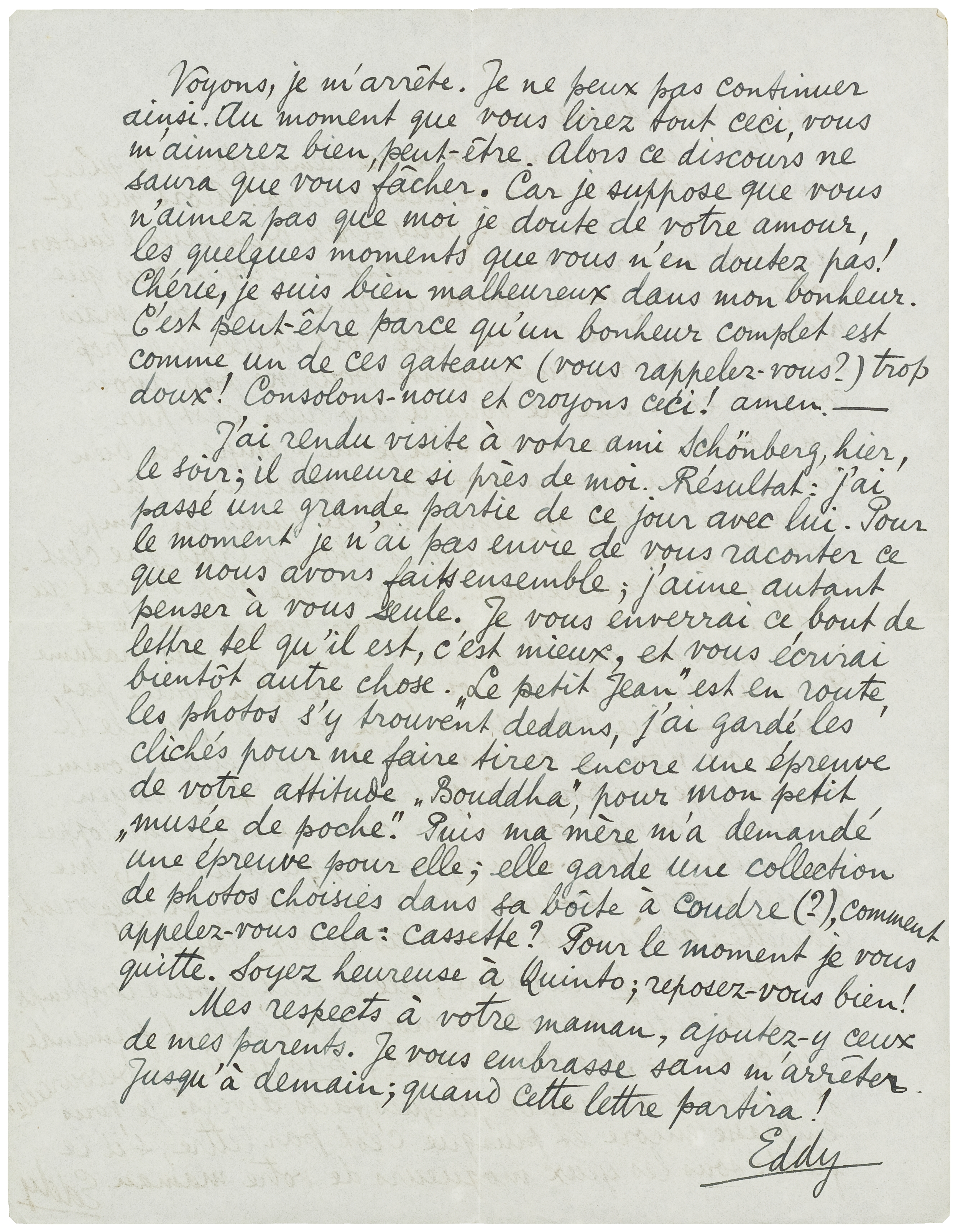 J'ai rendu visite à votre ami Schönberg, hier, le soir; il demeure si près de moi. Résultat: j'ai passé une grande partie de ce jour avec lui. Pour le moment je n'ai pas envie de vous raconter ce que nous avons faits ensemble; j'aime autant penser à vous seule. Je vous enverrai ce bout de lettre tel qu'il est, c'est mieux, et vous écrirai bientôt autre chose. ‘Le petit Jean’ est en route, les photos s'y trouvent dedans, j'ai gardé les clichés pour me faire tirer encore une épreuve de votre attitude ‘Bouddha’, pour mon petit ‘musée de poche’. Puis ma mère m'a demandé une épreuve pour elle; elle garde une collection de photos choisies dans sa boîte à coudre (?), comment appelez-vous cela: cassette? Pour le moment je vous quitte. Soyez heureuse à Quinto; reposez-vous bien!