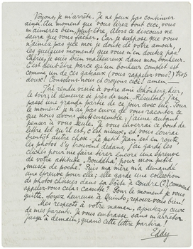 Voyons, je m'arrête. Je ne peux pas continuer ainsi. Au moment que vous lirez tout ceci, vous m'aimerez bien, peut-être. Alors ce discours ne saura que vous fâcher. Car je suppose que vous n'aimez pas que moi je doute de votre amour, les quelques moments que vous n'en doutez pas! Chérie, je suis bien malheureux de mon bonheur. C'est peut-être parce qu'un bonheur complet est comme un de ces gateaux ( vous rappelez-vous?) trop doux! Consolons-nous et croyons ceci! amen. -