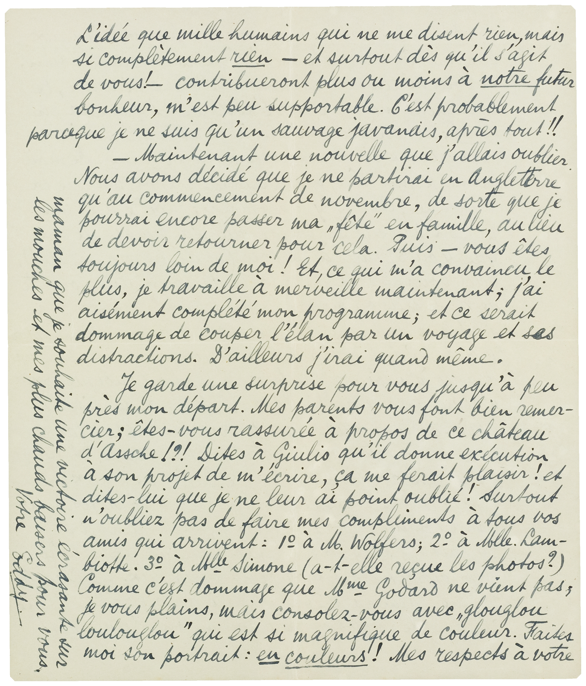 Je garde une surprise pour vous jusqu'à peu près mon départ. Mes parents vous font bien remercier; êtes-vous rassurée à propos de ce château d'Assche!?! Dites à Giulio qu'il donne exécution à son projet de m'écrire, ça me ferait plaisir! et dites-lui que je ne leur ai point oublié! Surtout n'oubliez pas de faire mes compliments à tous vos amis qui arrivent: 10 à M. Wolfers; 20 à Mlle. Lambiotte. 30 à Mlle Simone (a-t-elle reçue les photos?) Comme c'est dommage que Mme Godard ne vient pas; je vous plains, mais consolez-vous avec ‘glouglou loulouglou’ qui est si magnifique de couleur. Faites-moi son portrait: en couleurs! Mes respects à votre maman que je souhaite une victoire écrasante sur les mouches et mes plus chauds baisers pour vous.