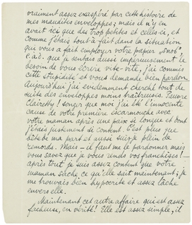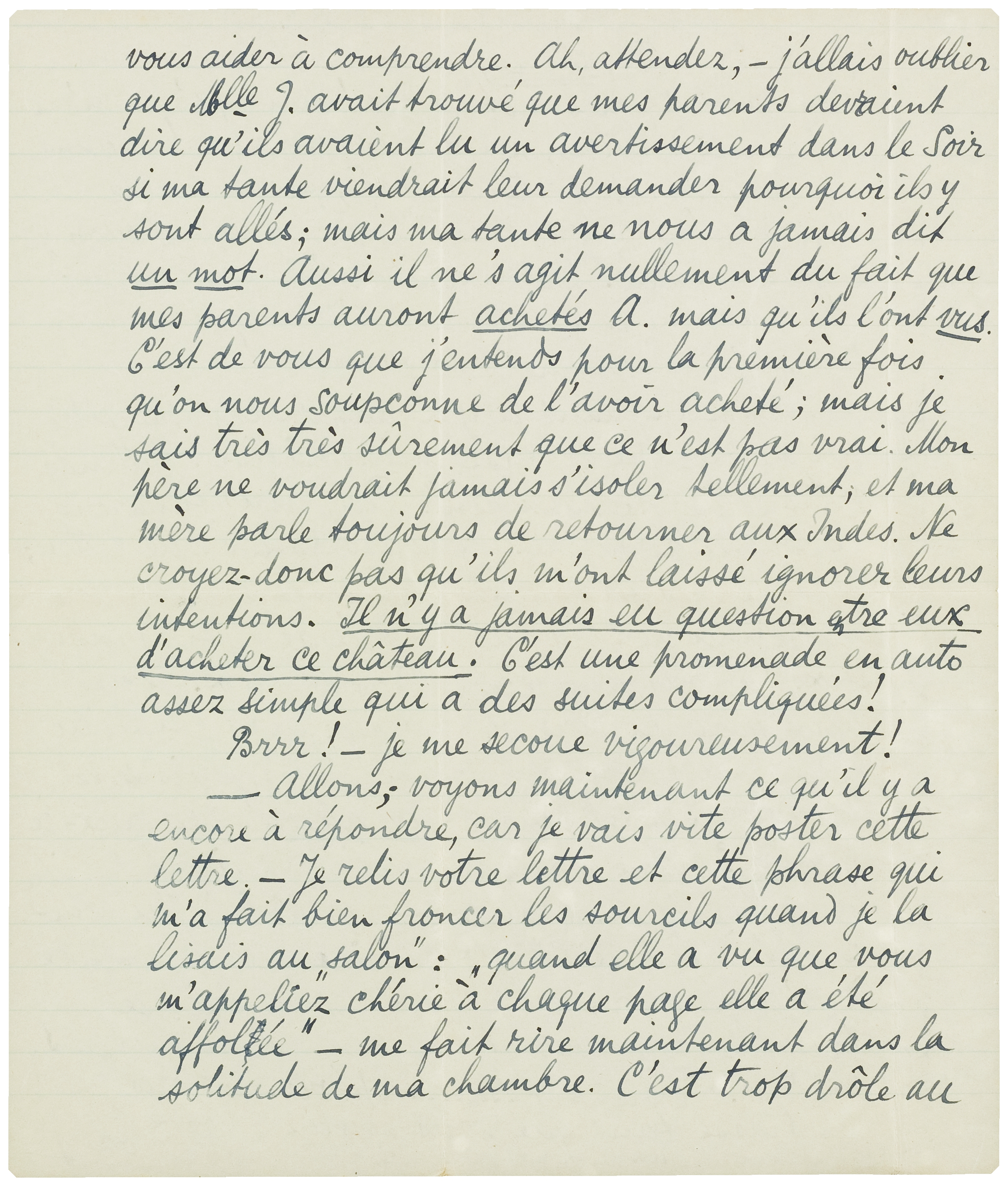 Voilà, j'aurais presque oublié de vous appeler ‘chérie’ sur cette page. Ce que je fais donc juste à temps: vous êtes consolée un peu, chérie? Mais qui a donc menti tellement, pauvre Clairette? Voici tout ce que j'en sais, moi, et je ne vous mens jamais. Peut-être que ceci pourra vous aider à comprendre. Ah, attendez, - j'allais oublier que Mlle J. avait trouvé que mes parents devraient dire qu'ils avaient lu un avertissement dans le Soir si ma tante viendrait leur demander pourquoi ils y sont allés; mais ma tante ne vous a jamais dit un mot. Aussi il ne s'agit nullement du fait que mes parents auront achetés A. mais qu'ils ont vus. C'est de vous que j'entends pour la première fois qu'on nous soupçonne de l'avoir acheté; mais je sais très très sûrement que ce n'est pas vrai. Mon père ne voudrait jamais s'isoler tellement; et ma mère parle toujours de retourner aux Indes. Ne croyez donc pas qu'ils m'ont laissé ignorer leurs intentions. Il n'y a jamais eu question entre eux d'acheter ce château. C'est une promenade en auto assez simple qui a des suites compliquées!