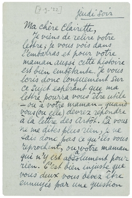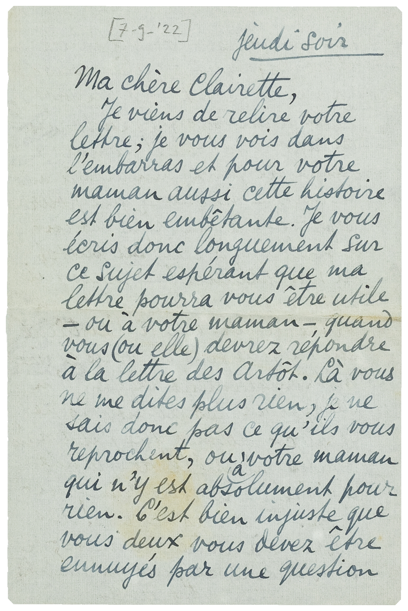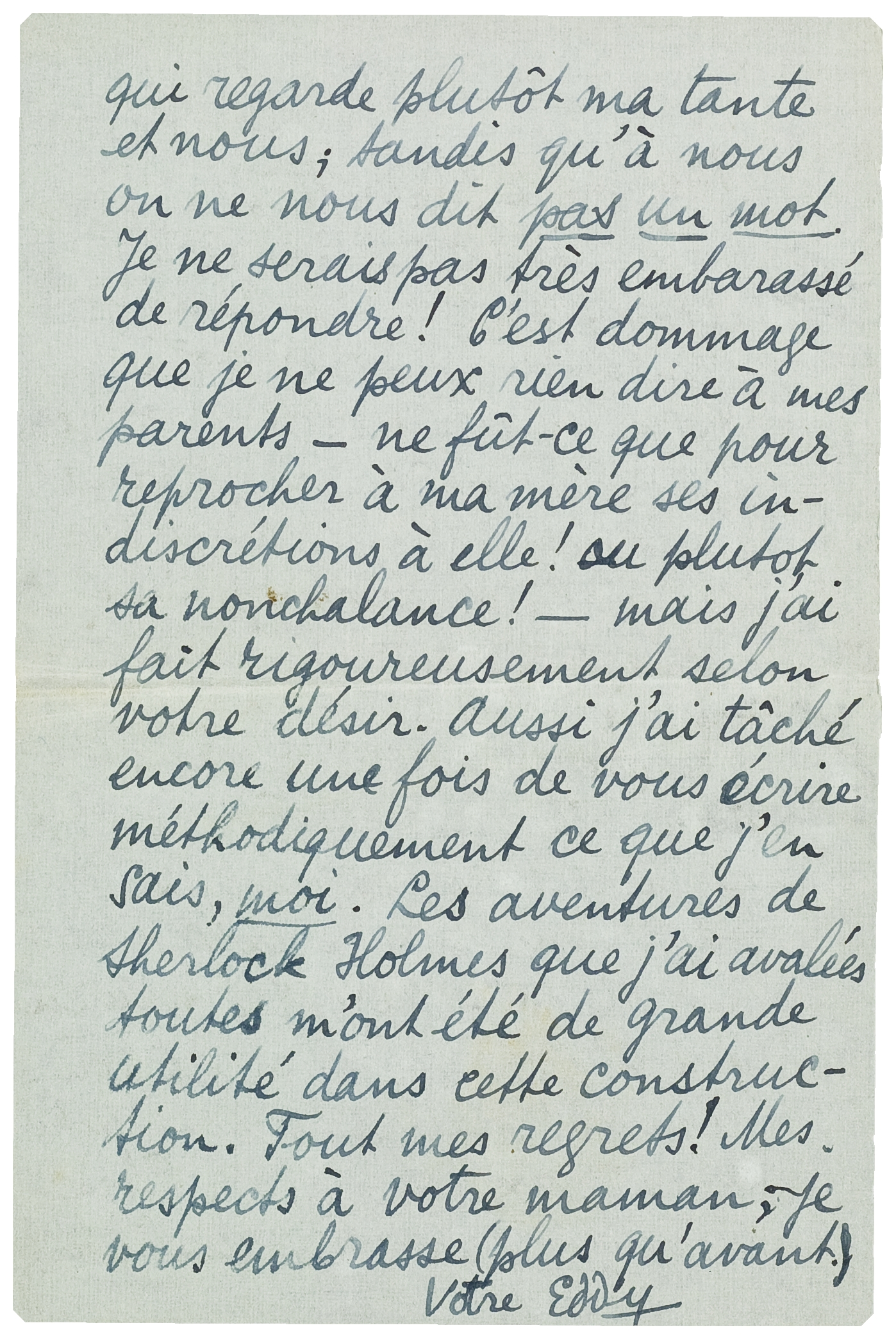 Je viens de relire votre lettre; je vous vois dans l'embarras et pour votre maman aussi cette histoire est bien embêtante. Je vous écris donc longuement sur ce sujet espérant que ma lettre pourra vous être utile - ou à votre maman - quand vous (ou elle) devrez répondre à la lettre des Artôt. Là vous ne me dites plus rien, je ne sais donc pas ce qu'ils vous reprochent, ou à votre maman qui n'y est absolument pour rien. C'est bien injuste que vous deux vous devez être ennuyés par une question qui regarde plutôt ma tante et nous; tandis qu'à nous on ne nous dit pas un mot. Je ne serais pas très embarassé de répondre! C'est dommage que je ne peux rien dire à mes parents - ne fût-ce que pour reprocher à ma mère ses indiscrétions à elle! ou plutot sa nonchalance! - mais j'ai fait rigoureusement selon votre désir. Aussi j'ai tâché encore une fois de vous écrire méthodiquement ce que j'en sais, moi. Les aventures de Sherlock Holmes que j'ai avalées toutes m'ont été de grande utilité dans cette construction. Tout mes regrets! Mes respects à votre maman; je vous embrasse (plus qu'avant)