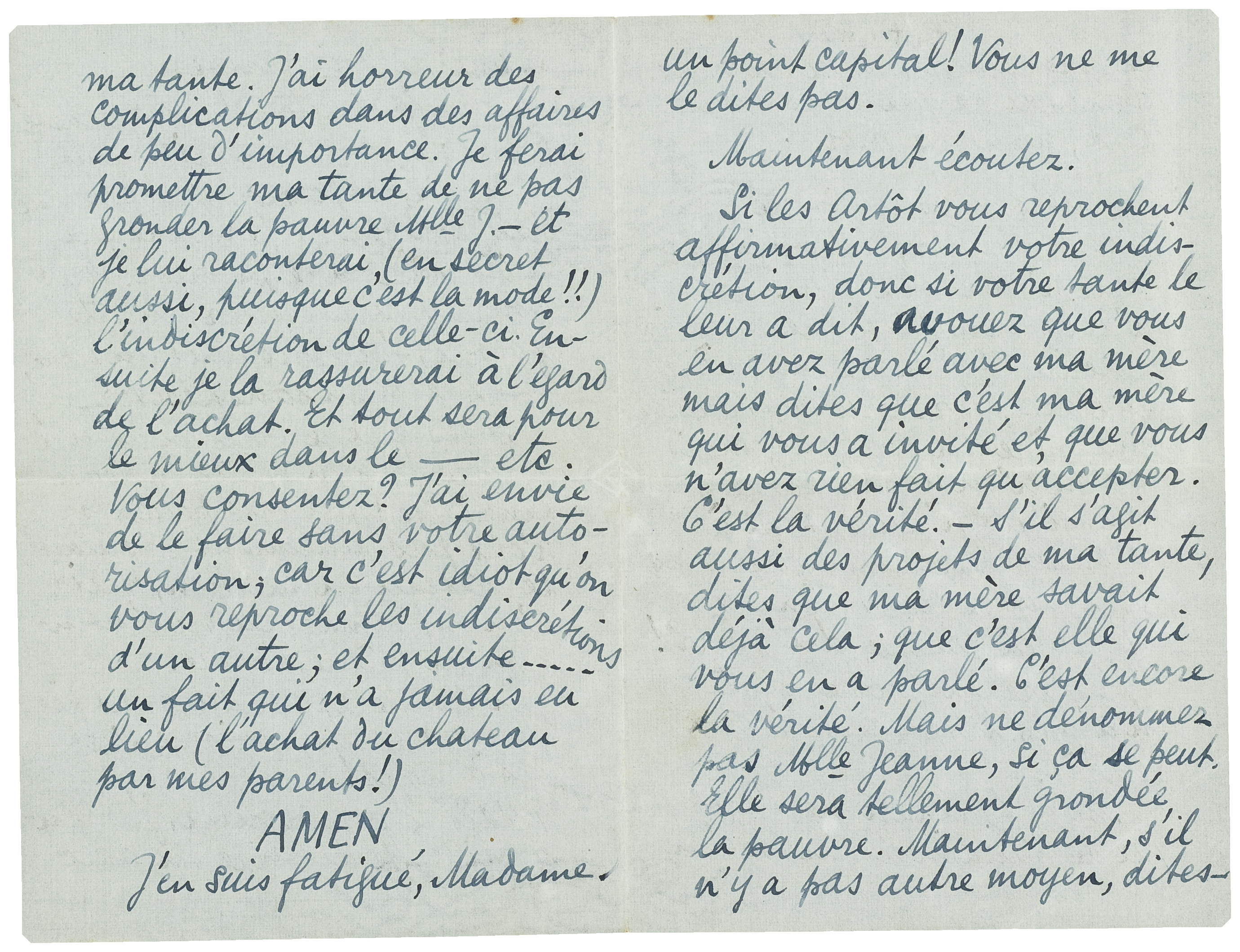(Mais si vous voulez, j'arrangerai cette histoire ici avec ma tante. J'ai horreur des complications dans des affaires de peu d'importance. Je ferai promettre ma tante de ne pas gronder la pauvre Mlle J. - et je lui raconterai (en secret aussi, puisque c'est la mode!!) l'indiscrétion de celle-ci. Ensuite je la rassurerai à l'égard de l'achat. Et tout sera pour le mieux dans le - etc. Vous consentez? J'ai envie de le faire sans votre autorisation; car c'est idiot qu'on vous reproche les indiscrétions d'une autre; et ensuite..... un fait qui n'a jamais eu lieu (l'achat du château par mes parents!)