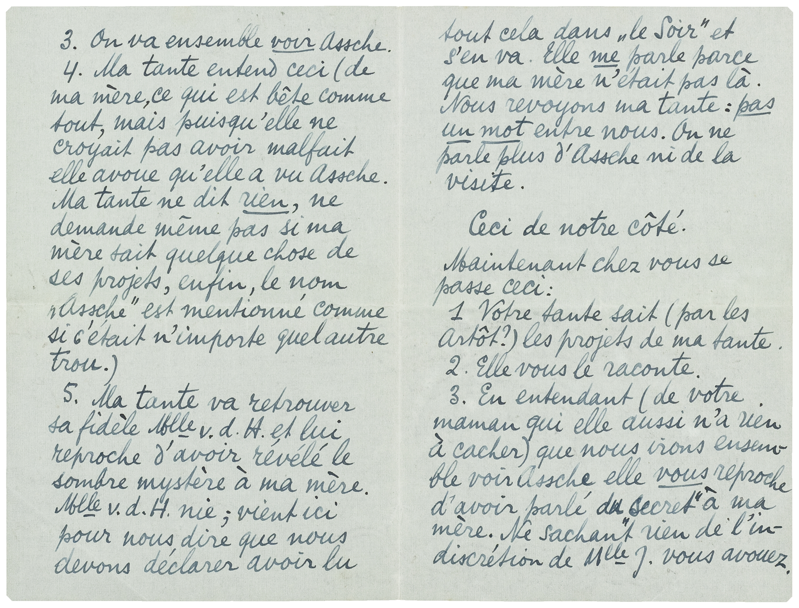 | 5. | Ma tante va retrouver sa fidèle Mlle v.d. H. et lui reproche d'avoir révélé le sombre mystère à ma mère. Mlle v.d. H. nie; vient ici pour nous dire que nous devons déclarer avoir lu tout cela dans ‘le Soir’ et s'en va. Elle me parle parce que ma mère n'était pas là. Nous revoyons ma tante: pas un mot entre nous. On ne parle plus d'Assche ni de la visite. |