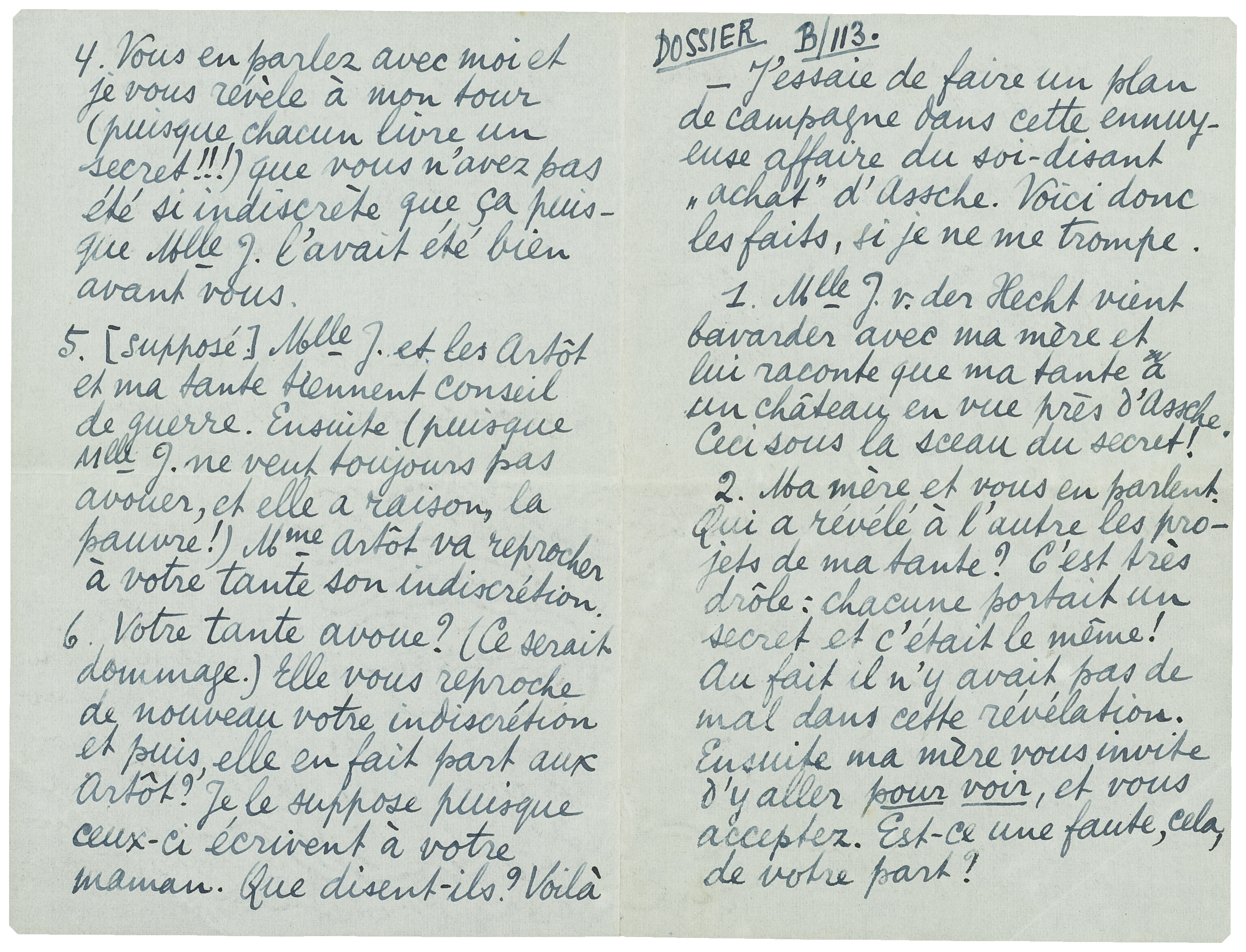 - J'essaie de faire un plan de campagne dans cette ennuyeuse affaire du soi-disant ‘achat’ d'Assche. Voici donc les faits, si je ne me trompe: