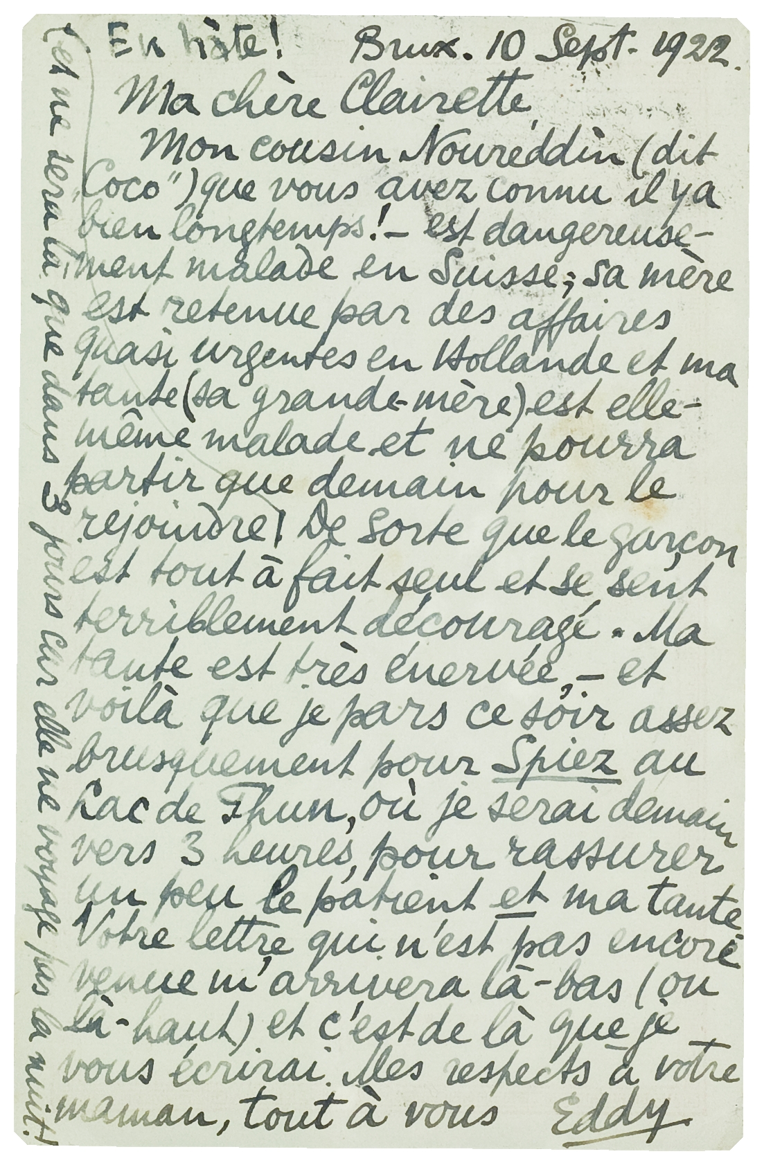 Mon cousin Noureddin (dit ‘Coco’) que vous avez connu il y a bien longtemps! - est dangereusement malade en Suisse; sa mère est retenue par des affaires quasi urgentes en Hollande et ma tante (sa grande-mère) est elle-même malade et ne pourra partir que demain pour le rejoindre et ne sera là que dans 3 jours car elle ne voyage pas la nuit! De sorte que le garçon est tout à fait seul et se sent terriblement découragé. Ma tante est très énervée, - et voilà que je pars ce soir assez brusquement pour Spiez au Lac de Thun, où je serai demain vers 3 heures, pour rassurer un peu le patient et ma tante. Votre lettre qui n'est pas encore venue m'arrivera là-bas (ou là-haut) et c'est de là que je vous écrirai. Mes respects à votre maman, tout à vous