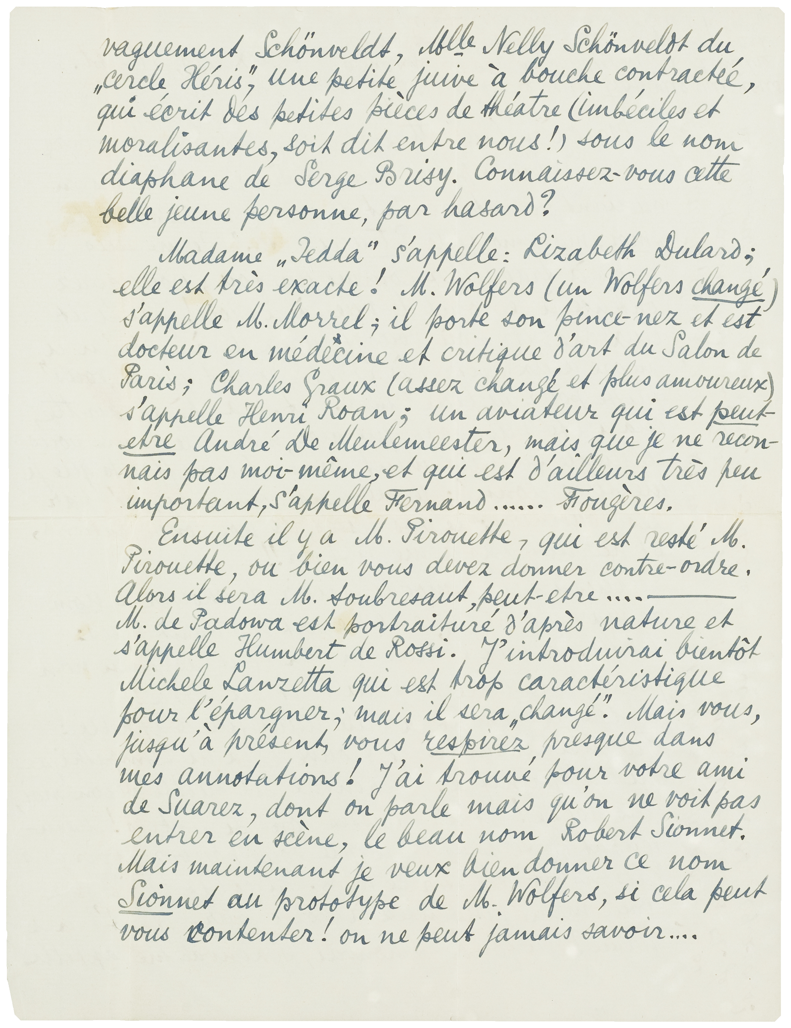 Madame ‘Iedda’ s'appelle: Lizabeth Dulard; elle est très exacte! M. Wolfers (un Wolfers changé) s'appelle M. Morrel; il porte son pince-nez et est docteur en médecine et critique d'art du Salon de Paris; Charles Graux (assez changé et plus amoureux) s'appelle Henri Roan; un aviateur qui est peut-etre André De Meulemeester, mais que je ne reconnais pas moi-même, et qui est d'ailleurs très peu important, s'appelle Fernand...... Fougères.