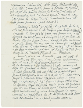 Pour le moment la belle jeune fille s'appelle: Florence Schonval. Je trouve cela ni sympathique ni antipathique. Schonval est suisse, selon moi, pas boche! Et les suisses sont si gentils! Maintenant il se peut bien que vous pouvez avoir des raisons pour détester ce nom. En ce cas choisissez vous même; inventez à votre tour. What's in a name? au fond. Schonval, Schonval me rappelle vaguement Schönveldt, Mlle Nelly Schönveldt du ‘cercle Héris’, une petite juive à bouche contractée, qui écrit des petites pièces de théatre (imbéciles et moralisantes, soit dit entre nous!) sous le nom diaphane de Serge Brisy. Connaissez-vous cette belle jeune personne par hasard?