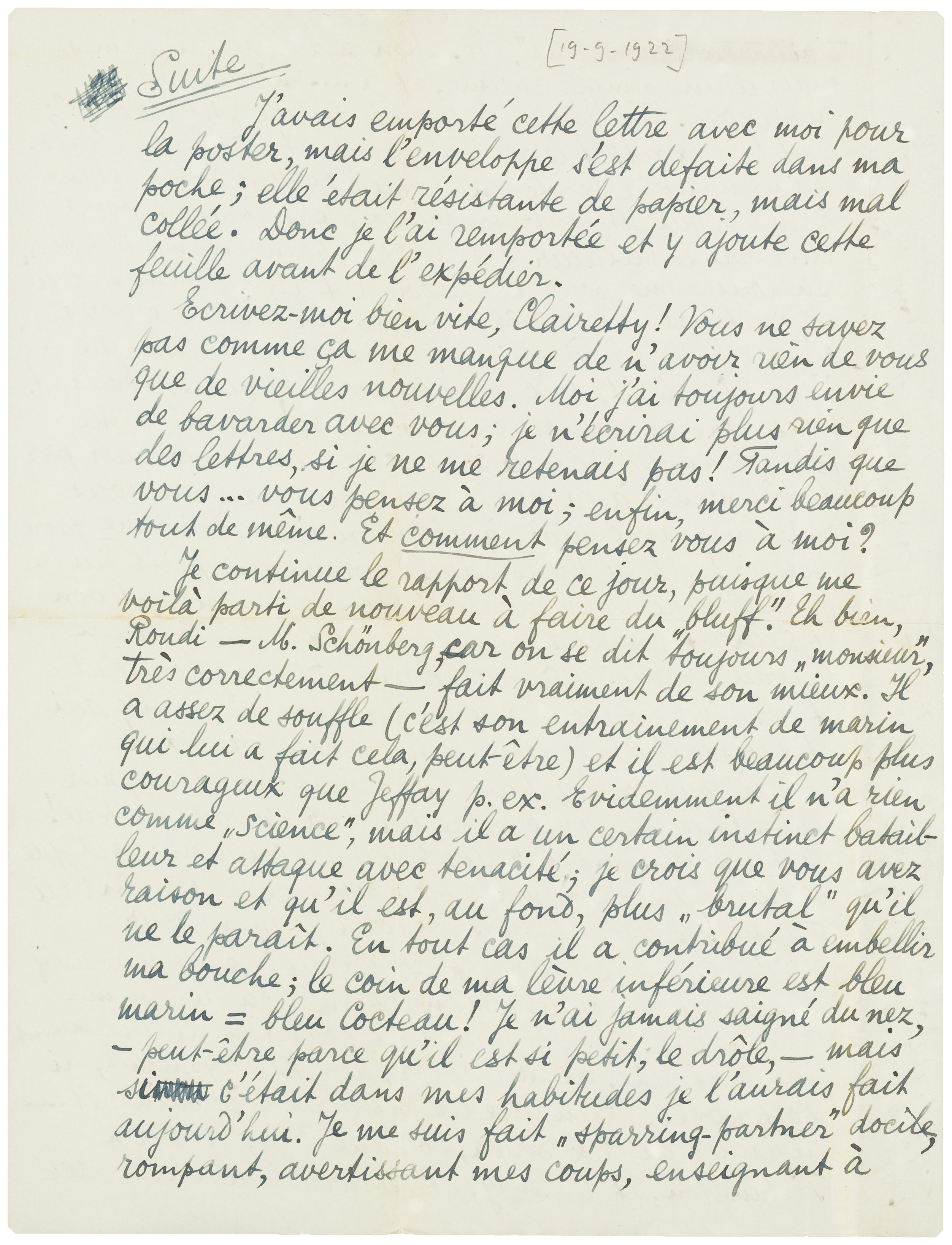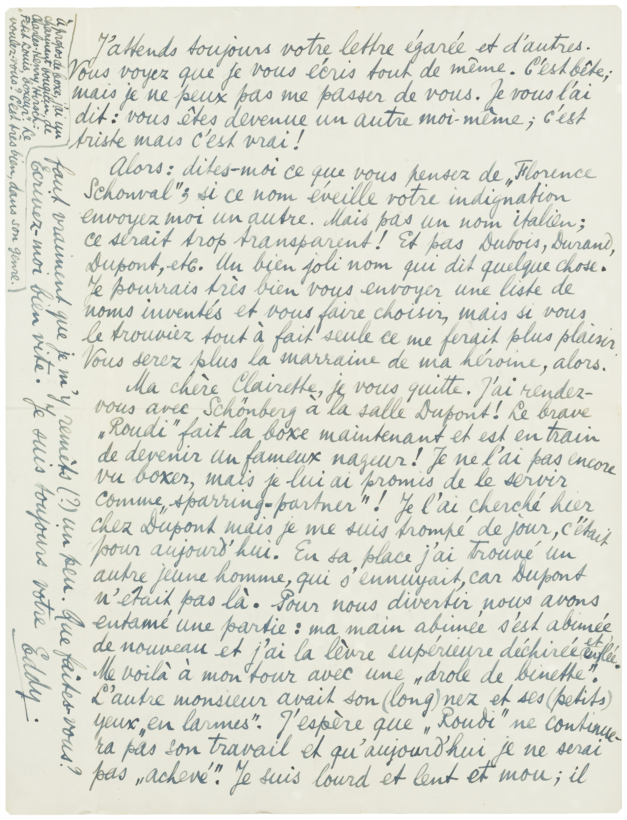 Ma chère Clairette, je vous quitte. J'ai rendez-vous avec Schönberg à la salle Dupont! Le brave ‘Roudi’ fait la boxe maintenant et est en train de devenir un fameux nageur! Je ne l'ai pas encore vu boxer, mais je lui ai promis de le servir comme ‘sparring-partner’! Je l'ai cherché hier chez Dupont mais je me suis trompé de jour, c'était pour aujourd'hui. En sa place j'ai trouvé un autre jeune homme, qui s'ennuyait, car Dupont n'était pas là. Pour nous divertir nous avons entamé une partie: ma main abimée s'est abimée de nouveau et j'ai la lèvre supérieure déchirée et enflée. Me voilà à mon tour avec une ‘drole de binette’. L'autre monsieur avait son (long) nez et ses (petits) yeux ‘en larmes’. J'espère que ‘Roudi’ ne continuera pas son travail et qu'aujourd'hui je ne serai pas ‘achevé’. Je suis lourd et lent et mou; il faut vraiment que je m'y remêts (?) un peu. Que faites-vous? Ecrivez-moi bien vite. Je suis toujours votre