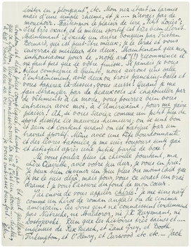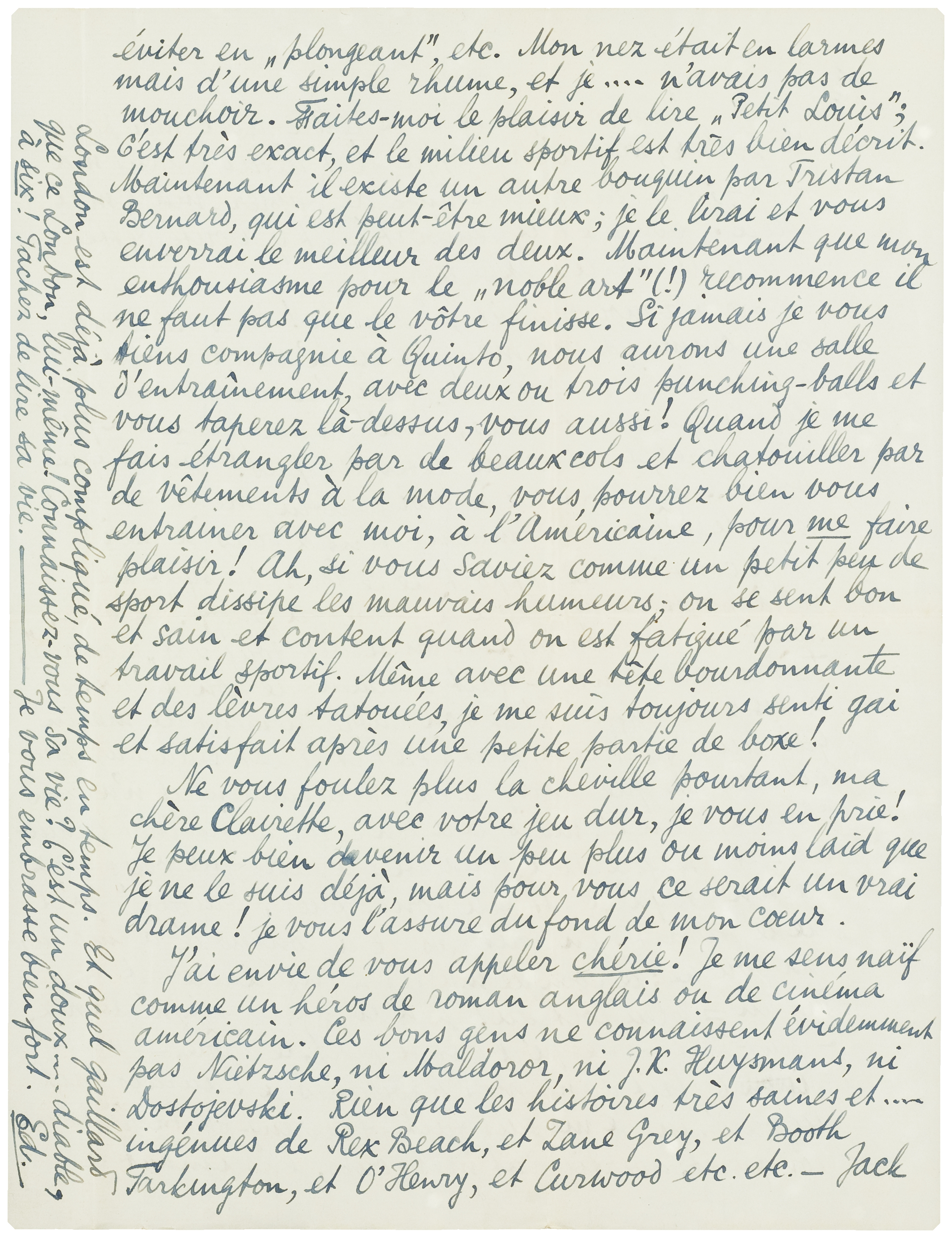 J'ai envie de vous appeler chérie! Je me sens naïf comme un héros de roman anglais ou de cinéma américain. Ces bons gens ne connaissent évidemment pas Nietzsche, ni Maldoror, ni J.K. Huysmans, ni Dostojevski. Rien que les histoires très saines et..... ingénues de Rex Beach, et Zane Grey, et Booth Tarkington, et O'Henry, et Curwood etc. etc. - Jack London est déjà plus compliqué, de temps en temps. Et quel gaillard que ce London, lui-même! Connaissez-vous sa vie? C'est un doux.... diable, à six! Tachez de lire sa vie. - Je vous embrasse bien fort.