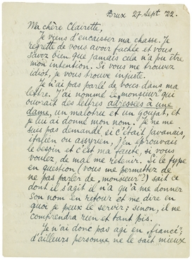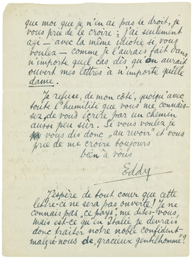 Je refuse, de mon côté, quoiqu'avec toute l'humilité que vous me connaissez, de vous écrire par un chemin aussi peu sûr. Si vous voulez je vous dis donc ‘au revoir’ et vous prie de me croire toujours
