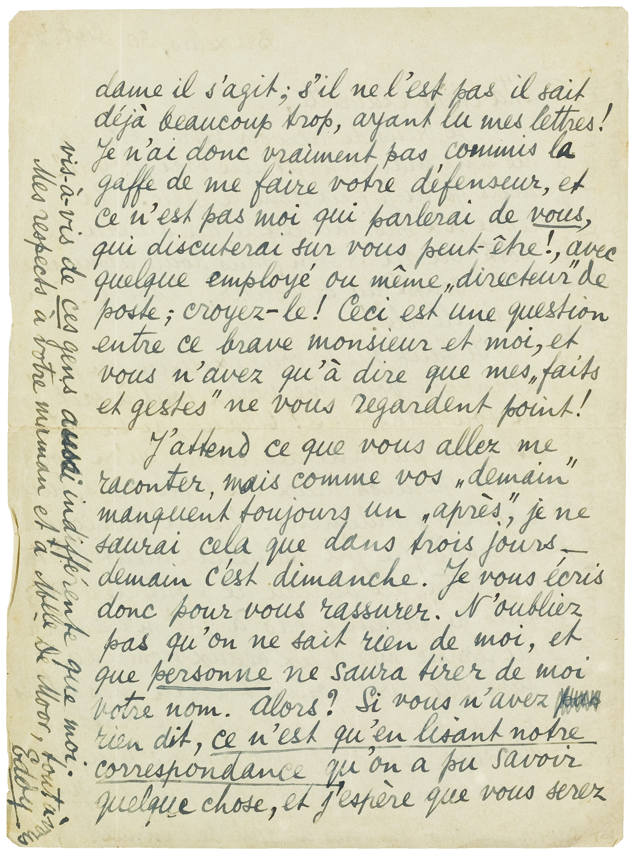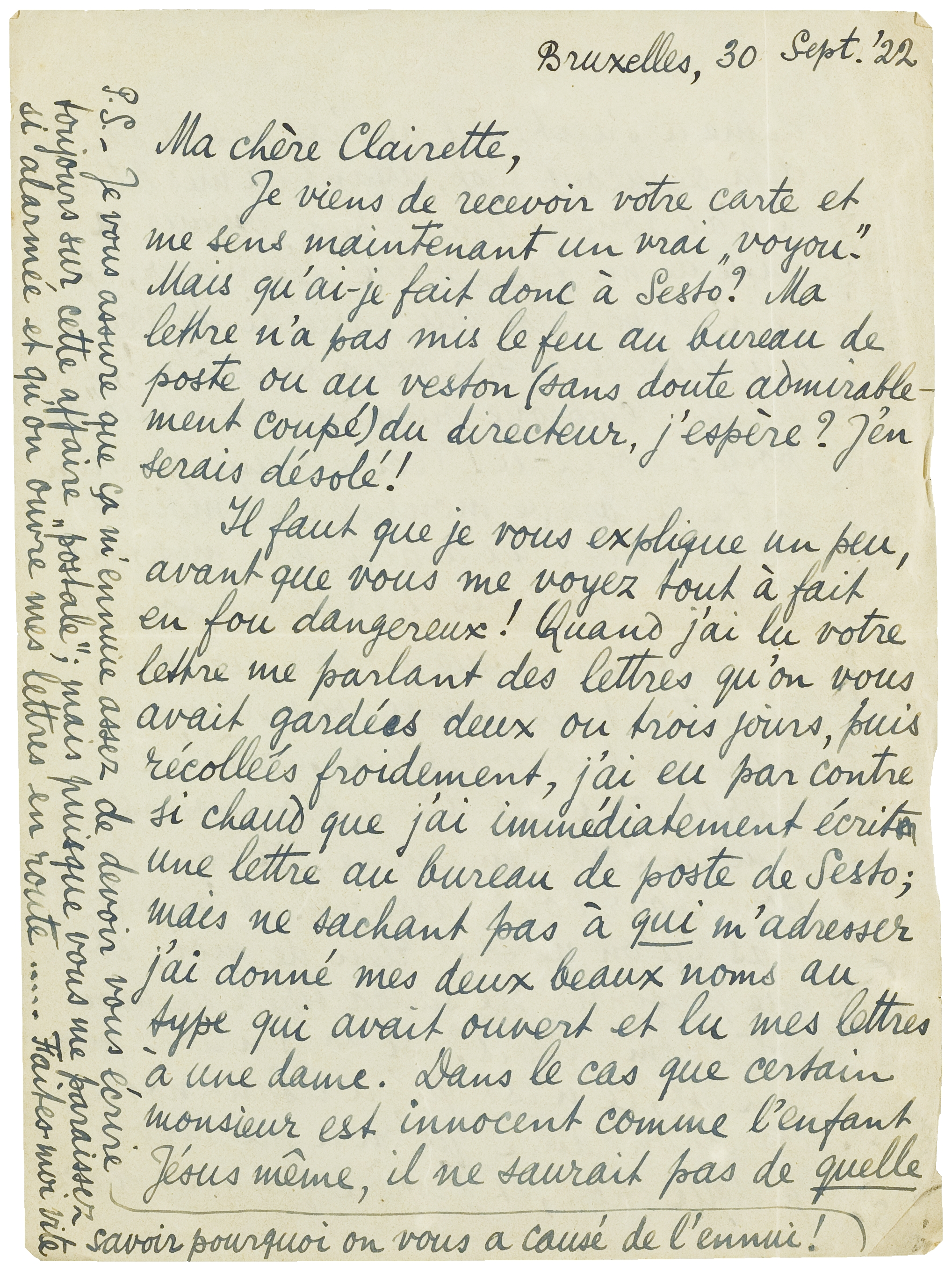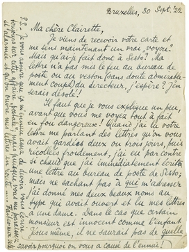 P.S. - Je vous assure que ça m'ennuie assez de devoir vous écrire toujours sur cette affaire ‘postale’; mais puisque vous me paraissez si alarmée et qu'on ouvre mes lettres en route..... Faites-moi vite savoir pourquoi on vous a causé de l'ennui!