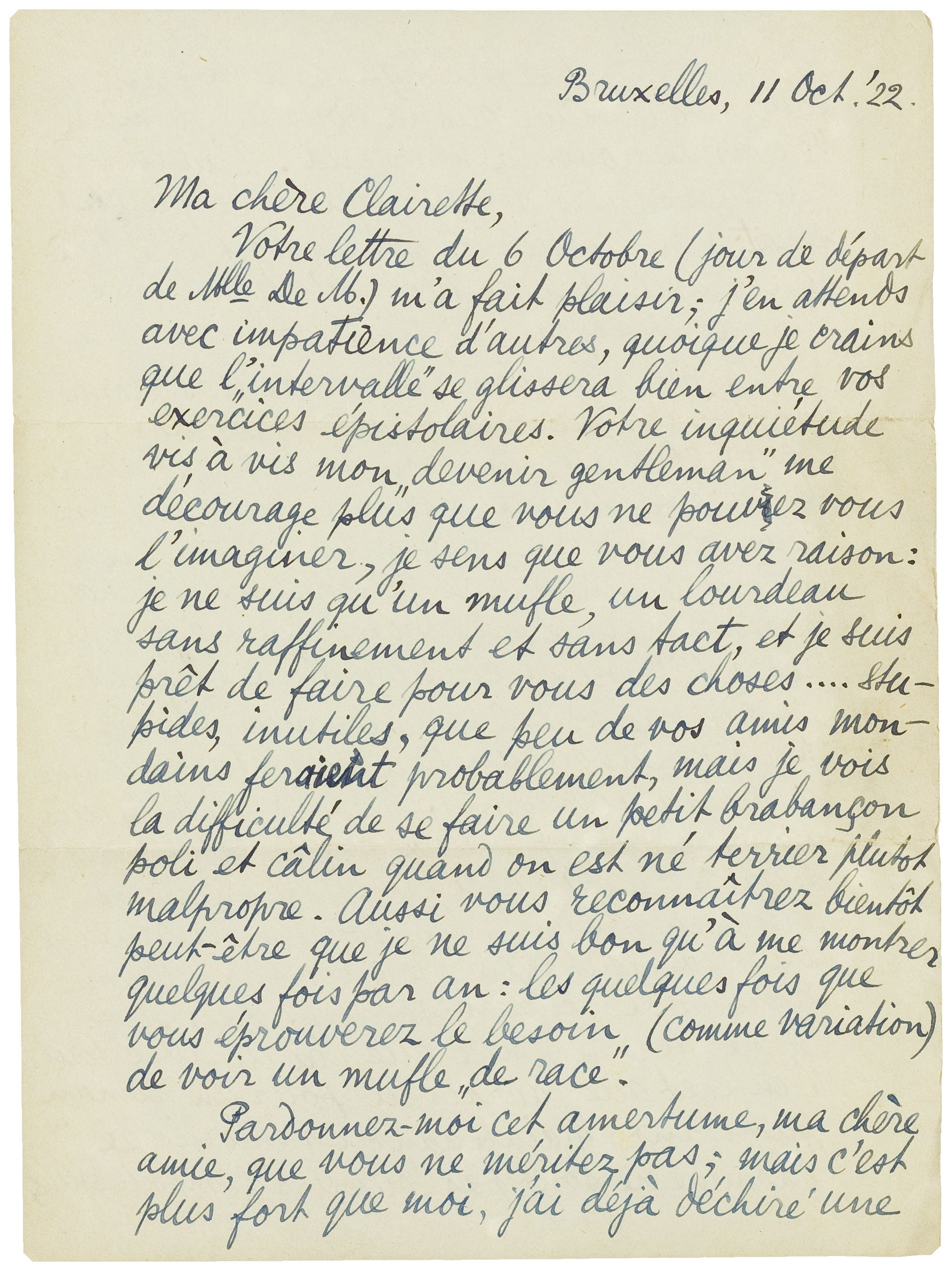Votre lettre du 6 Octobre (jour de départ de Mlle De M.) m'a fait plaisir; j'en attends avec impatience d'autres, quoique je crains que l'‘intervalle’ se glissera bien entre vos exercices épistolaires. Votre inquiétude vis à vis mon ‘devenir gentleman’ me décourage plus que vous ne pouvez vous l'imaginer, je sens que vous avez raison: je ne suis qu'un mufle, un lourdeau sans raffinement et sans tact, et je suis prêt de faire pour vous des choses.... stupides, inutiles, que peu de vos amis mondains feraient probablement, mais je vois la difficulté de se faire un petit brabançon poli et câlin quand on est né terrier plutot malpropre. Aussi vous reconnaîtrez bientôt peut-être que je ne suis bon qu'à me montrer quelques fois par an: les quelques fois que vous éprouverez le besoin (comme variation) de voir un mufle ‘de race’.