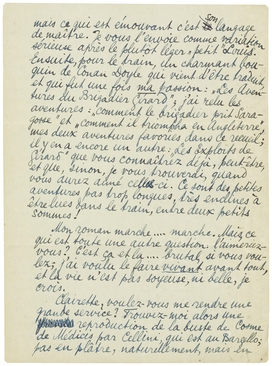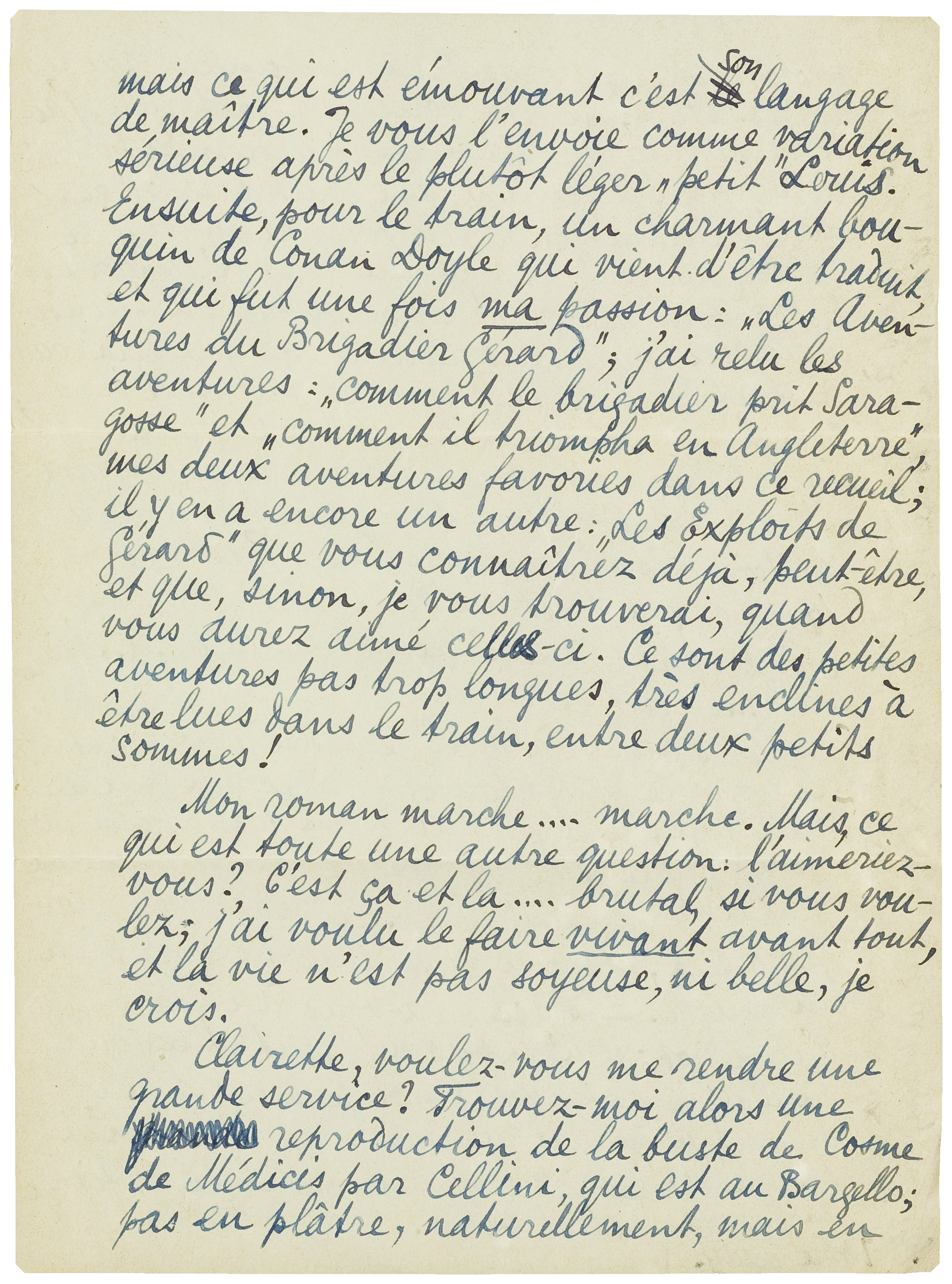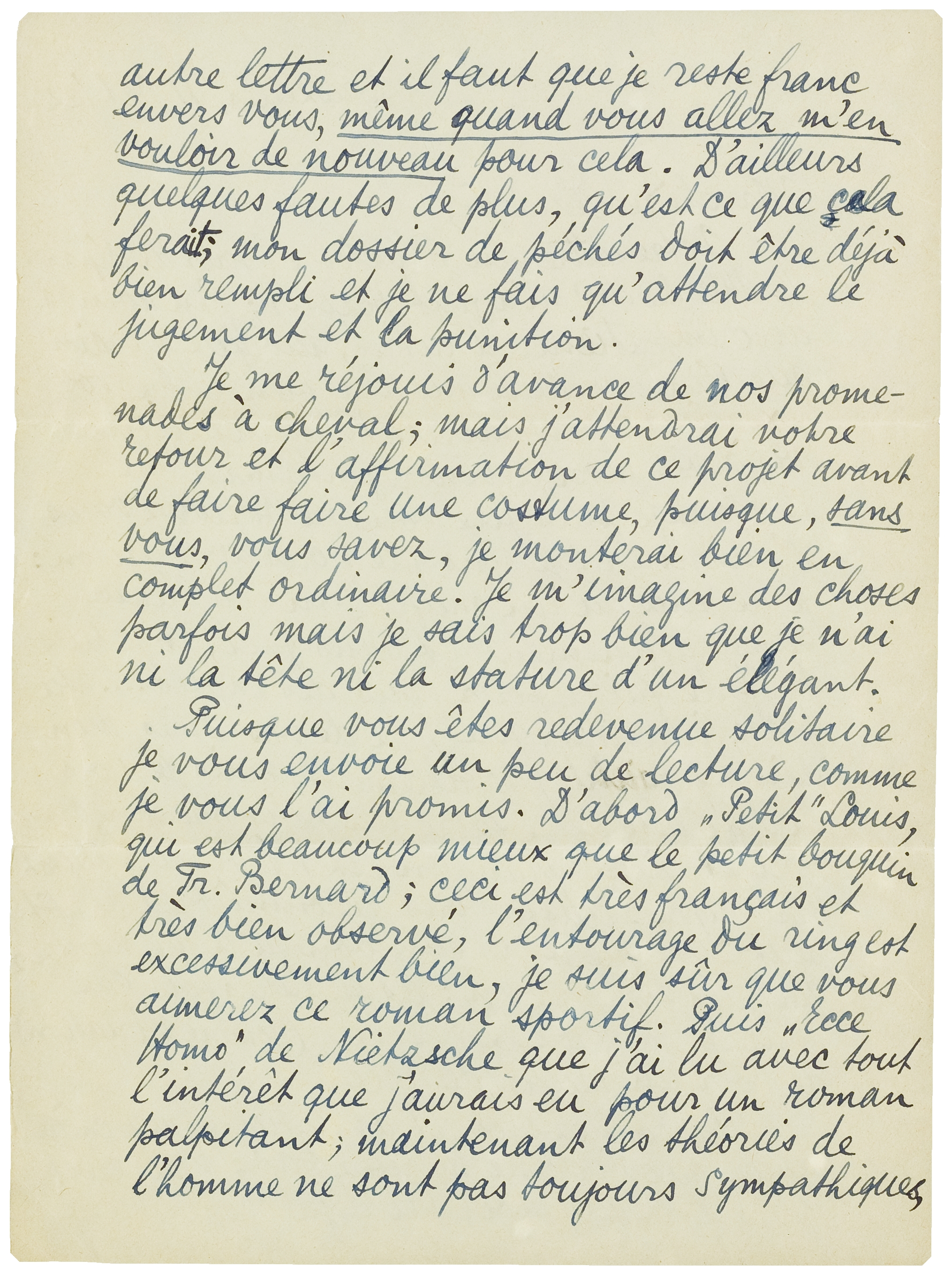 Puisque vous êtes redevenue solitaire je vous envoie un peu de lecture, comme je vous l'ai promis. D'abord ‘Petit’ Louis, qui est beaucoup mieux que le petit bouquin de Tr. Bernard; ceci est très français et très bien observé, l'entourage du ring est excessivement bien, je suis sûr que vous aimerez ce roman sportif. Puis Ecce Homo de Nietzsche que j'ai lu avec tout l'intérêt que j'aurais eu pour un roman palpitant; maintenant les théories de l'homme ne sont pas toujours sympathiques, mais ce qui est émouvant c'est son langage de maître. Je vous l'envoie comme variation sérieuse après le plutôt léger ‘petit’ Louis. Ensuite, pour le train, un charmant bouquin de Conan Doyle qui vient d'être traduit, et qui fut une fois ma passion: Les Aventures du Brigadier Gérard; j'ai relu les aventures: ‘comment le brigadier prit Saragosse’ et ‘comment il triompha en Angleterre’, mes deux aventures favories dans ce recueil; il y en a une autre: Les Exploits de Gérard que vous connaîtrez déjà, peut-être, et que, sinon, je vous trouverai, quand vous aurez aimé celles-ci. Ce sont des petites aventures pas trop longues, très enclines à être lues dans le train, entre deux petits sommes!