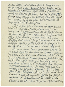 Pardonnez-moi cet amertume, ma chère amie, que vous ne méritez pas; mais c'est plus fort que moi, j'ai déjà déchiré une autre lettre et il faut que je reste franc envers vous, même quand vous allez m'en vouloir de nouveau pour cela. D'ailleurs quelques fautes de plus, qu'est ce que cela ferait; mon dossier de péchés doit être déjà bien rempli et je ne fais qu'attendre le jugement et la punition.