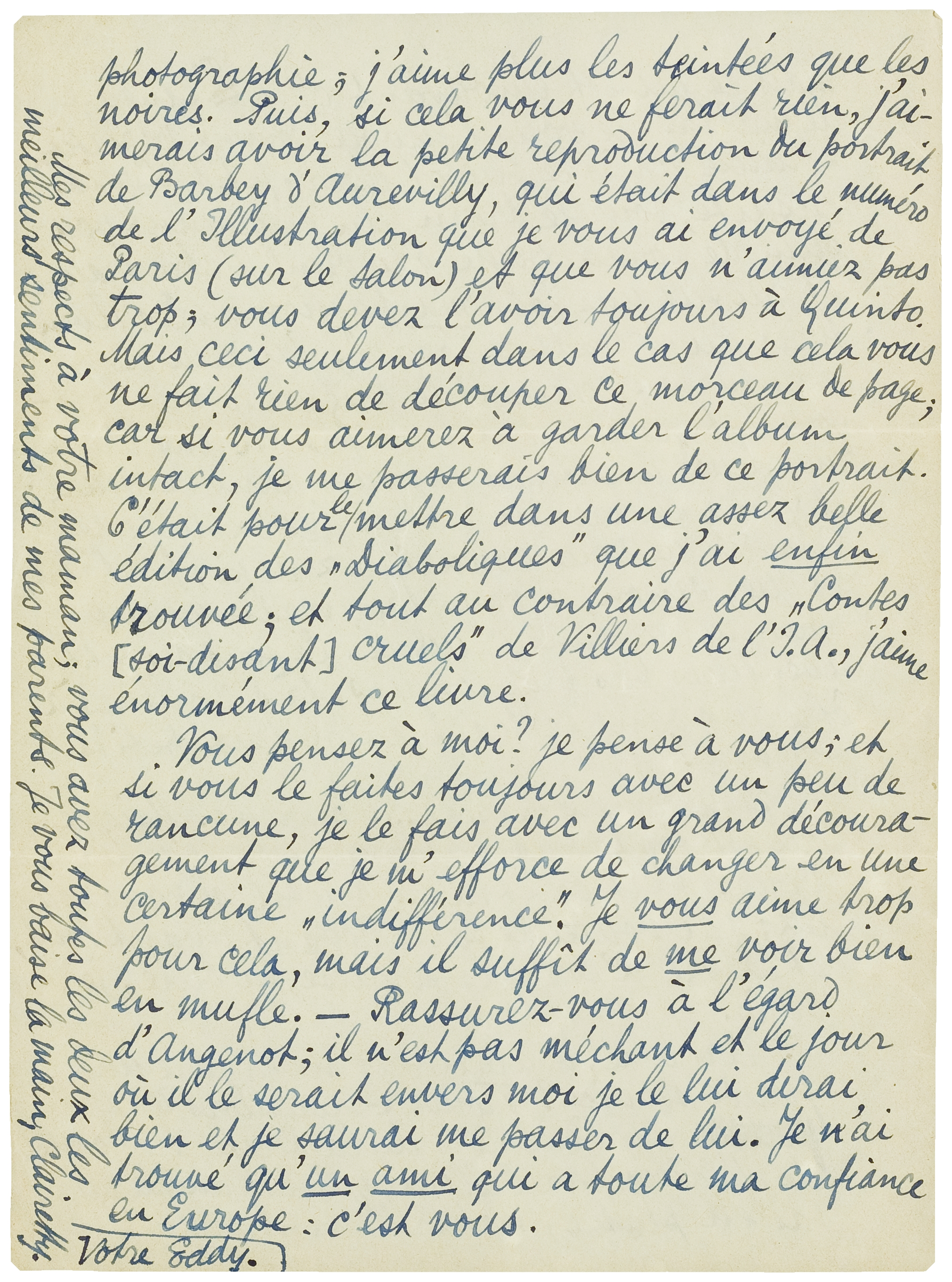 Clairette, voulez-vous me rendre une grande service? Trouvez-moi alors une reproduction de la buste de Cosme de Médicis par Cellini, qui est au Bargello; pas en plâtre, naturellement, mais en photographie; j'aime plus les teintées que les noires. Puis, si cela vous ne ferait rien, j'aimerais avoir la petite reproduction du portrait de Barbey d'Aurevilly, qui était dans le numéro de l'Illustration que je vous ai envoyé de Paris (sur le Salon) et que vous n'aimiez pas trop; vous devez l'avoir toujours à Quinto. Mais ceci seulement dans le cas que cela vous ne fait rien de découper ce morceau de page; car si vous aimerez à garder l'album intact, je me passerais bien de ce portrait. C'était pour le mettre dans une assez belle édition des Diaboliques que j'ai enfin trouvée; et tout au contraire des Contes (soi-disant) cruels de Villiers de l'I.A., j'aime énormément ce livre.