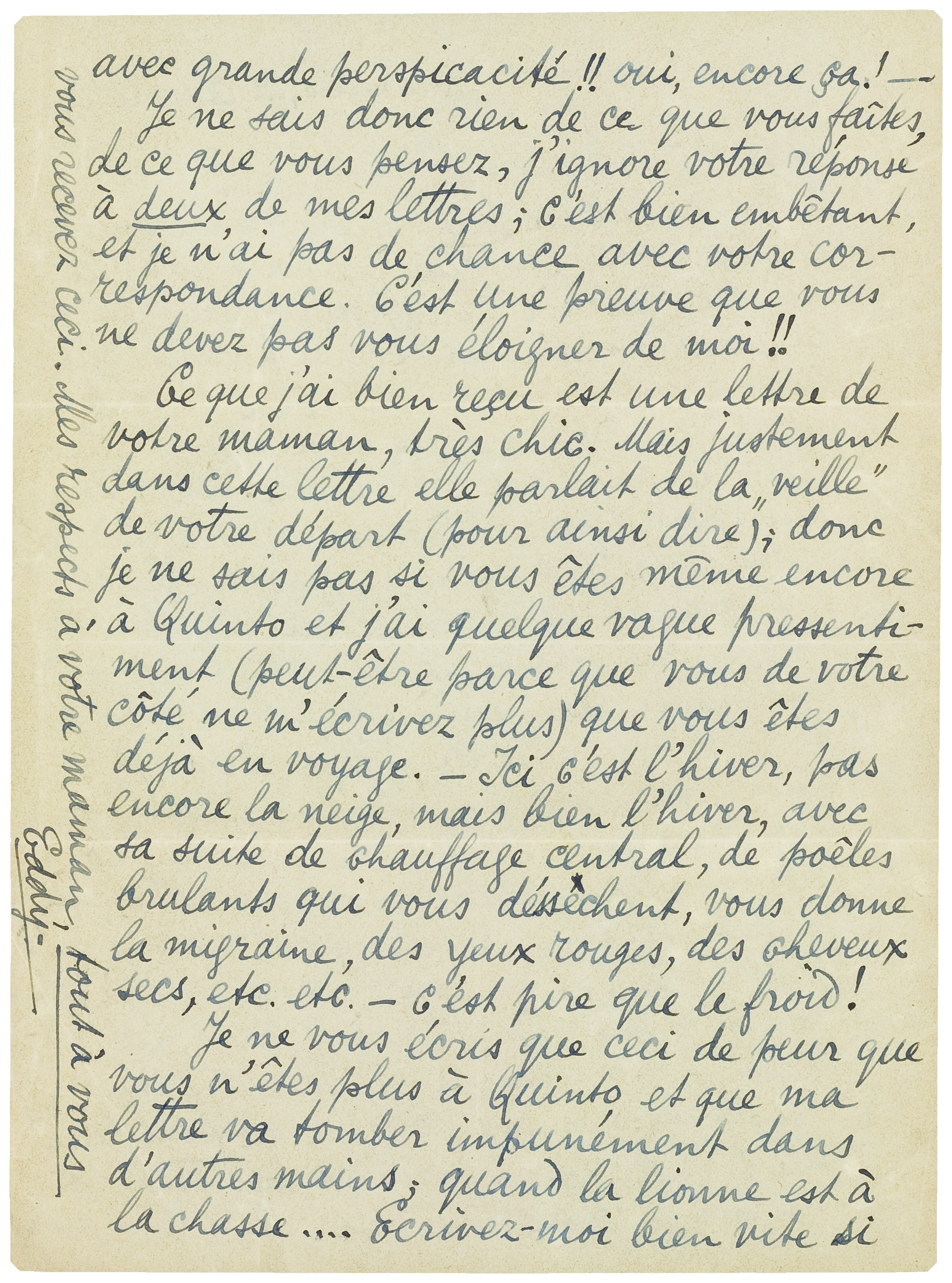Je ne vous écris que ceci de peur que vous n'êtes plus à Quinto et que ma lettre va tomber impunément dans d'autres mains; quand la lionne est à la chasse.... Ecrivez-moi bien vite si vous recevez ceci. Mes respects à votre maman, tout à vous