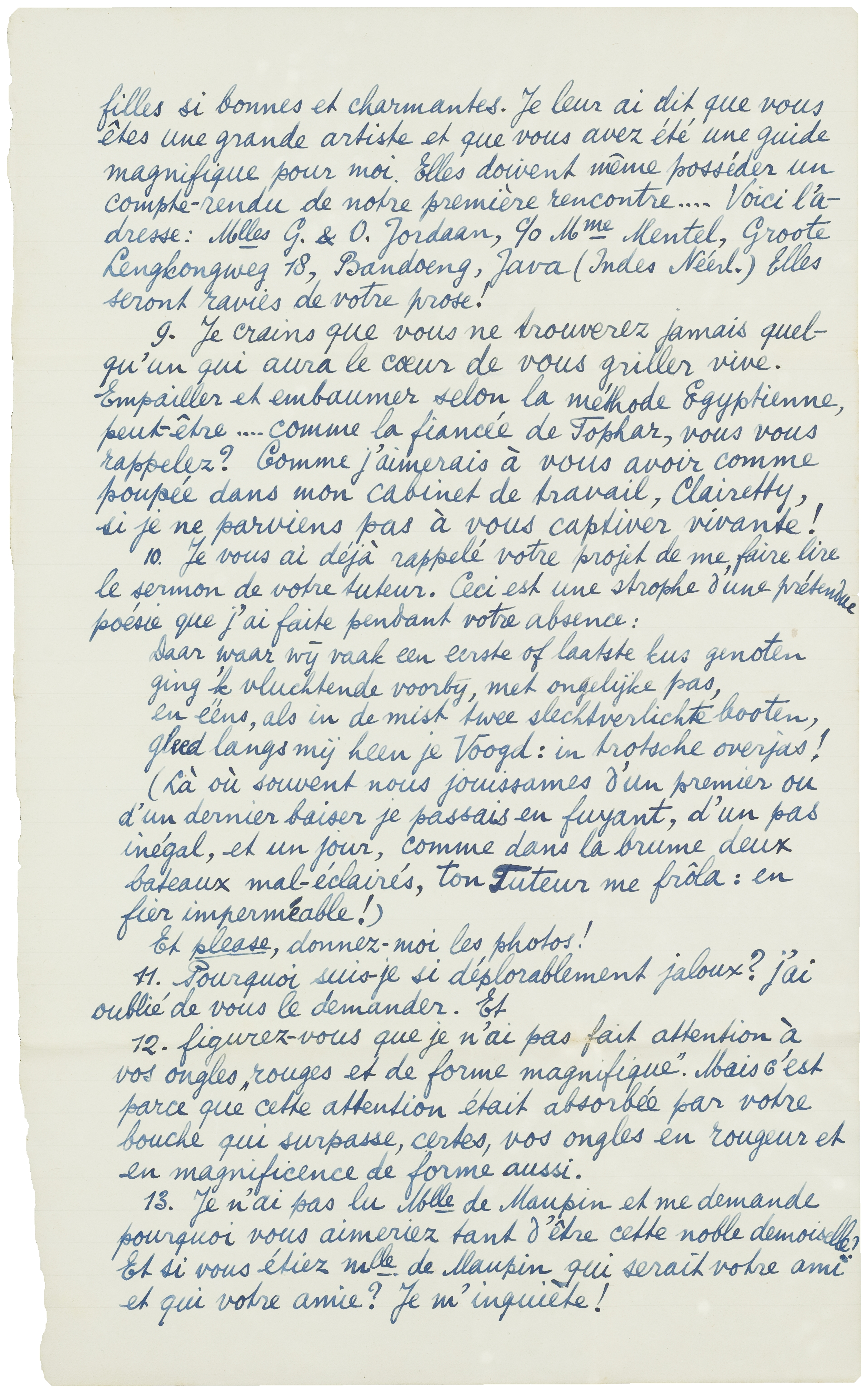 | 8. | Ce serait gentille (et mondaine!) si vous pourriez écrire une petite lettre aux Jordaan; ce sont des petites filles si bonnes et charmantes. Je leur ai dit que vous êtes une grande artiste et que vous avez été une guide magnifique pour moi. Elles doivent même posséder un compte-rendu de notre première rencontre.... Voici l'adresse: Mlles G. & O. Jordaan, c/o Mme Mentel, Groote Lengkongweg 18, Bandoeng, Java (Indes Néerl.) Elles seront ravies de votre prose! |