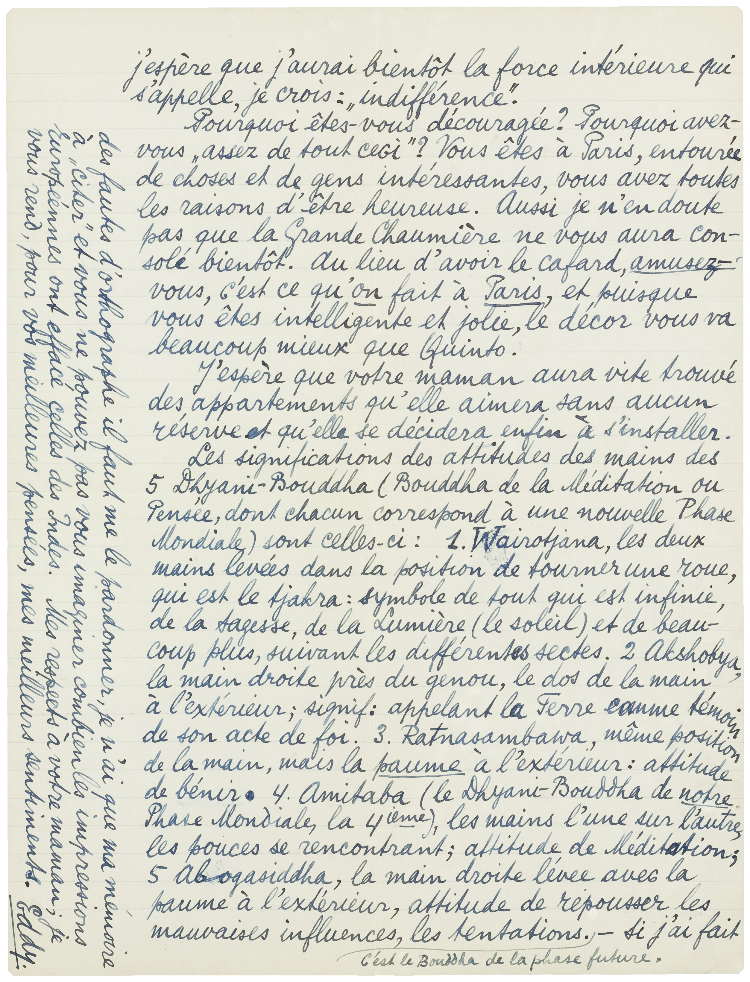 Les significations des attitudes des mains des 5 Dhyani-Bouddha (Bouddha de la Méditation ou Pensée, dont chacun correspond à une nouvelle Phase Mondiale) sont celles-ci: 1. Wairotjana, les deux mains levées dans la position de tourner une roue, qui est le tjakra: symbole de tout qui est infinie, de la Sagesse, de la Lumière (le soleil) et de beaucoup plus, suivant les différentes sectes. 2. Akshobya, la main droite près du genou, le dos de la main à l'extérieur; signif: appelant la Terre comme témoin de son acte de foi. 3. Ratnasambawa, même position de la main, mais la paume à l'extérieur: attitude de bénir. 4. Amitaba (le Dyani-Bouddha de notre phase Mondiale, la 4ième), les mains l'une sur l'autre, les pouces se rencontrant; attitude de Méditation; 5. Abogasiddha, la main droite lévee avec la paume à l'extérieur, attitude de repousser les mauvaises influences, les tentations. C'est le Bouddha de la phase future. - Si j'ai fait des fautes d'orthographe il faut me pardonner, je n'ai que ma mémoire à ‘citer’ et vous ne pouvez pas vous imaginer combien les impressions Européennes ont effacé celles des Indes. Mes respects à votre maman; je vous rend, pour vos meilleures pensées, mes meilleurs sentiments.