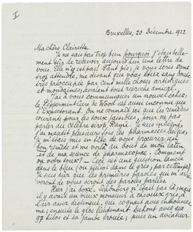 J'ai à vous communiquer un nouvel échec: le Peppermint-Cure de Wood est aussi inconnu que l'Expectorant. On ne connaît ici que les remèdes courants pour les toux paisibles, pour ne pas parler du célèbre sirop Rami. Je suis indigné, j'ai maudit plusieurs fois les pharmacies belges; je m'étais mis en tête de vous procurer un bon remède et me voilà au bout de mon latin et de ma science de pharmacopae. Comment va votre toux? - Ceci est une question lancée dans le bleu (ou plûtot dans le gris, par ce temps). Je suis sûr que les premières paroles qui m'arriveront de vous seront des paroles parlées.