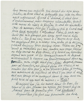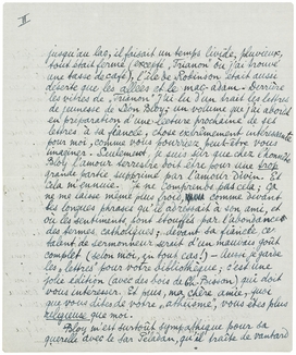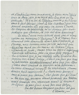 Bloy m'est surtoût sympathique pour sa querelle avec le Sar Péladan, qu'il traîte de vantard et d'imbécile; vous connaissez, je crois, mon dégoût pour ce Mage, que je ne veux plus lire, quoi qu'on prétende! Il y a ici de Péladan encore 4 ou 5 livres tout à fait épuisés (dont Le Vice Suprême) que vous pouvez emporter dès que vous en aurez l'envie. Cet Assyrien de vaudeville m'est devenu plus antipathique que Cocteau, ce qui est dire beaucoup!