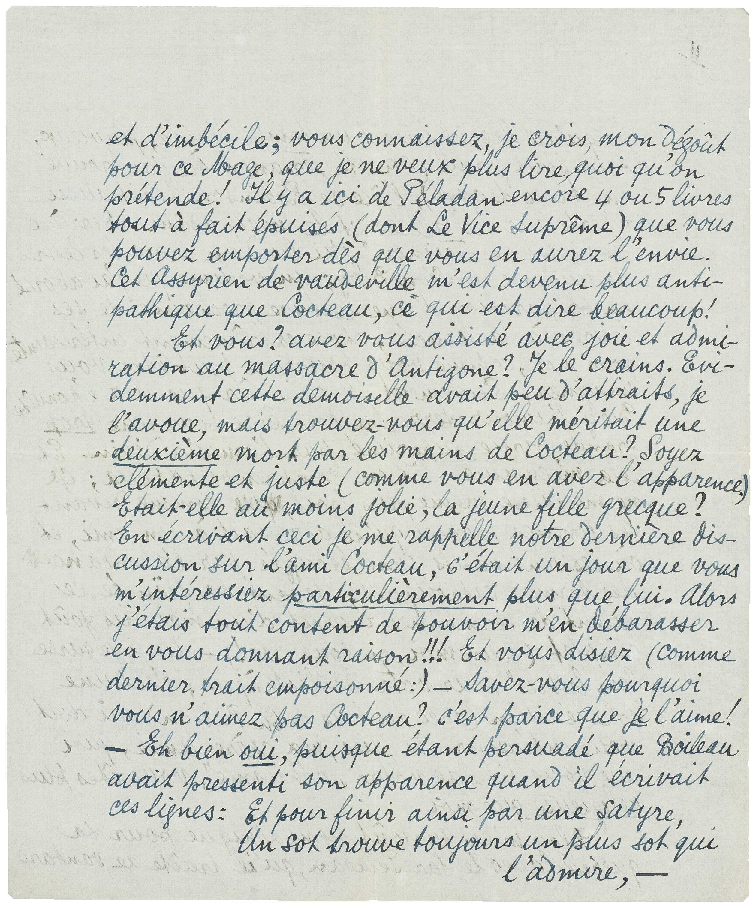 Et vous? avez-vous assisté avec joie et admiration au massacre d'Antigone? Je le crains. Evidemment cette demoiselle avait peu d'attraits, je l'avoue, mais trouvez-vous qu'elle méritait une deuxième mort par les mains de Cocteau? Soyez clémente et juste (comme vous en avez l'apparence.) Etait-elle au moins jolie, la jeune fille grecque? En écrivant ceci je me rappelle notre dernière discussion sur l'ami Cocteau, c'était un jour que vous m'intéressiez particulièrement plus que lui. Alors j'étais tout content de pouvoir m'en débarasser en vous donnant raison!!! Et vous disiez (comme dernier trait empoisonné:) - Savez-vous pourquoi vous n'aimez pas Cocteau? c'est parce que je l'aime! - Eh bien oui, puisque étant persuadé que Boileau avait pressenti son apparence quand il écrivait ces lignes: