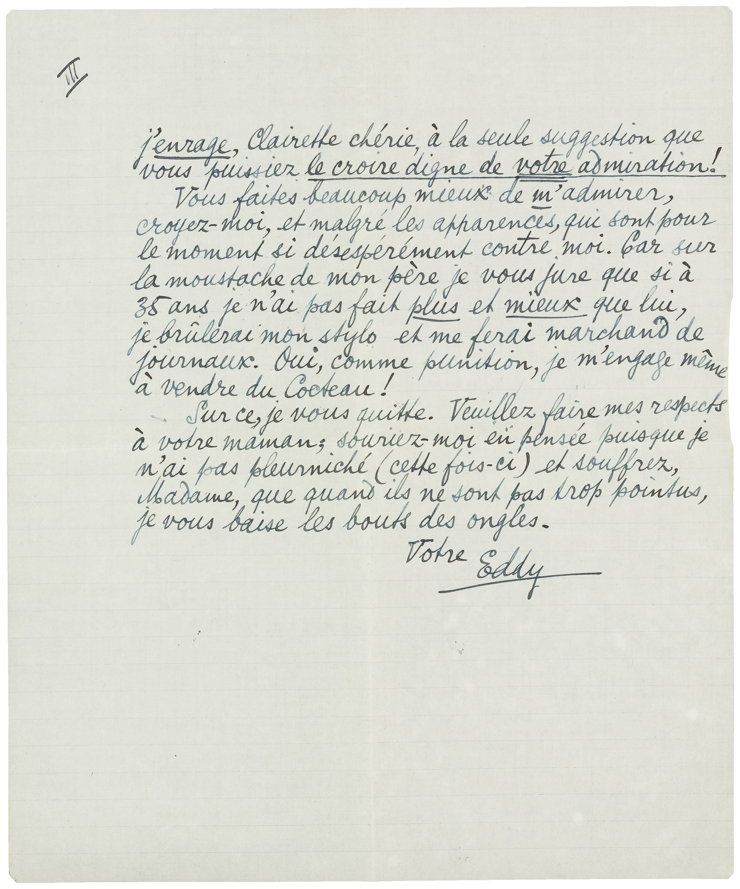 Vous faites beaucoup mieux de m'admirer, croyez-moi, et malgré les apparences, qui sont pour le moment si désespérément contre moi. Car sur la moustache de mon père je vous jure que si à 35 ans, je n'ai pas fait plus et mieux que lui, je brûlerai mon stylo et me ferai marchand de journaux. Oui, comme punition, je m'engage même à vendre du Cocteau!