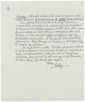 Sur ce, je vous quitte. Veuillez faire mes respects à votre maman; souriez-moi en pensée puisque je n'ai pas pleurniché (cette fois-ci) et souffrez, Madame, que quand ils ne sont pas trop pointus, je vous baise les bouts des ongles.