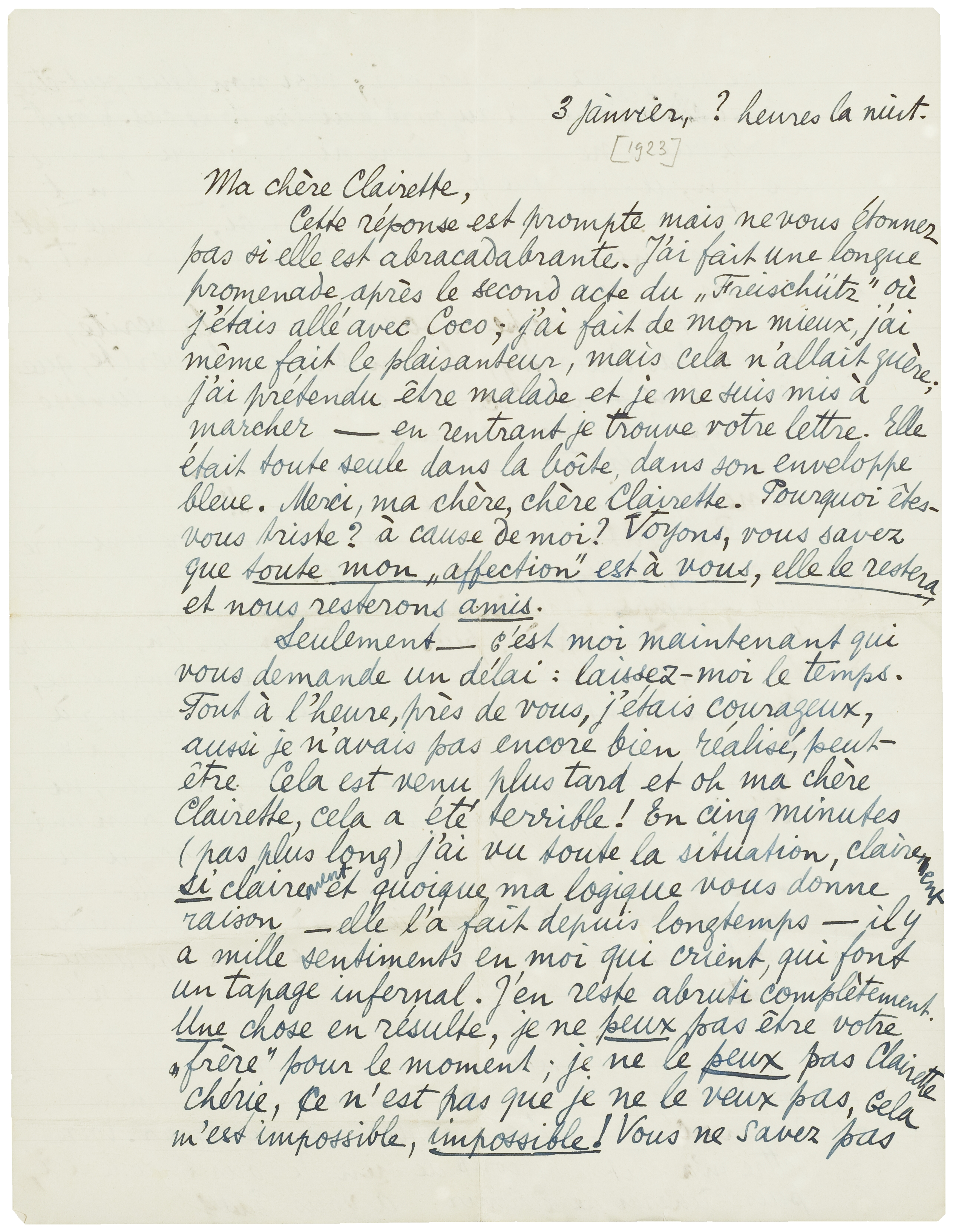Cette réponse est prompte mais ne vous étonnez pas si elle est abracadabrante. J'ai fait une longue promenade après le second acte du Freischütz où j'étais allé avec Coco; j'ai fait de mon mieux, j'ai même fait le plaisanteur, mais cela n'allait guère; j'ai prétendu être malade et je me suis mis à marcher - en rentrant je trouve votre lettre. Elle était toute seule dans la boîte, dans son enveloppe bleue. Merci, ma chère, chère Clairette. Pourquoi êtes-vous triste? à cause de moi? Voyons, vous savez que toute mon ‘affection’ est à vous, elle le restera, et nous resterons amis.