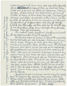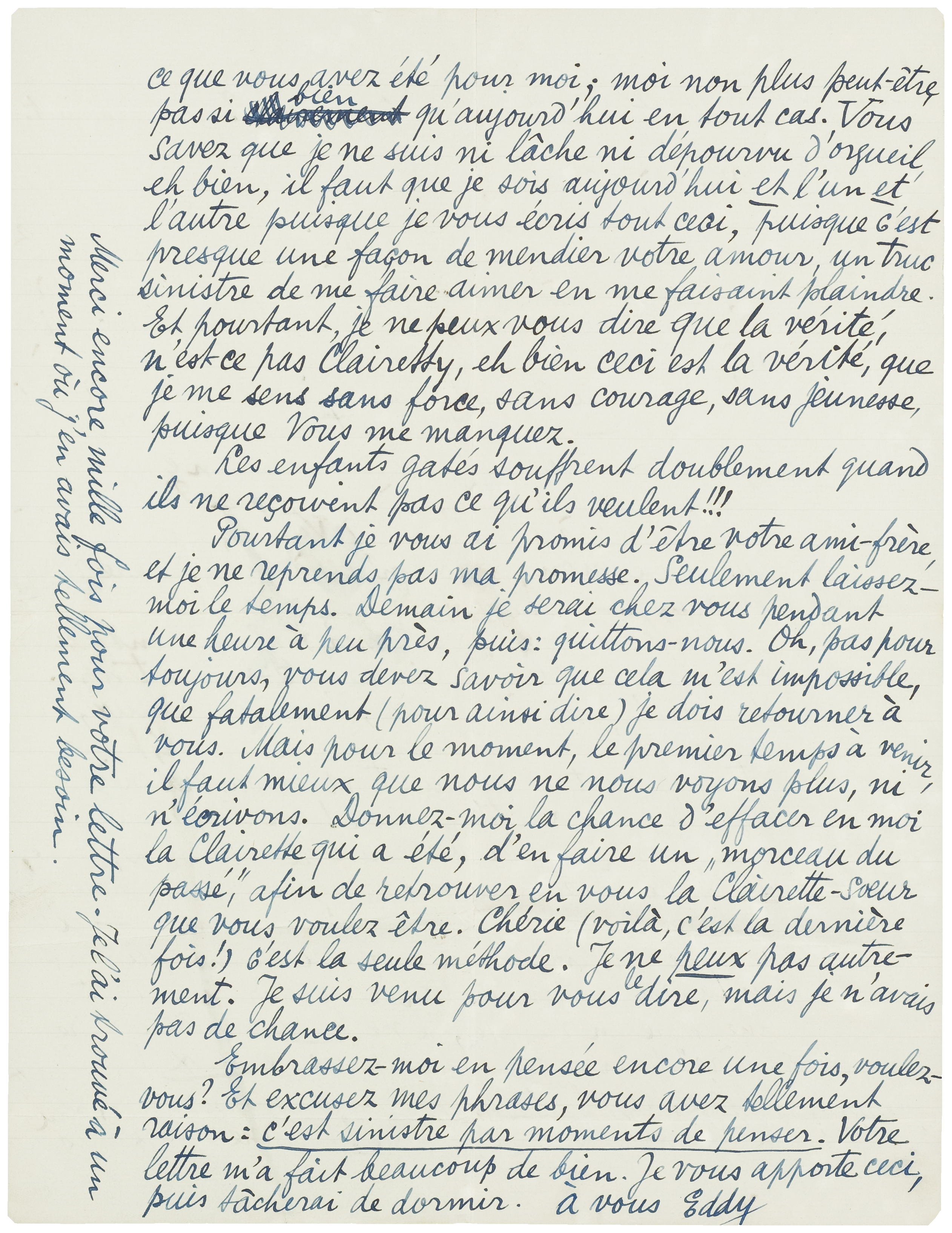 Seulement - c'est moi maintenant qui vous demande un délai: laissez-moi le temps. Tout à l'heure, près de vous, j'étais courageux, aussi je n'avais pas encore bien réalisé, peut-être. Cela est venu plus tard et oh ma chère Clairette, cela a été terrible! En cinq minutes (pas plus long) j'ai vu toute la situation, clairement si clairement et quoique ma logique vous donne raison - elle l'a fait depuis longtemps - il y a mille sentiments en moi qui crient, qui font un tapage infernal. J'en reste abruti complètement. Une_chose en résulte, je ne peux pas être votre ‘frère’ pour le moment; je ne le peux pas Clairette chérie, ce n'est pas que je ne le veux pas, cela m'est impossible, impossible! Vous ne savez pas ce que vous avez été pour moi; moi non plus peut-être, pas si bien qu'aujourd'hui en tout cas. Vous savez que je ne suis ni lâche ni dépourvu d'orgueil, eh bien, il faut que je sois aujourd'hui et l'un et l'autre puisque je vous écris tout ceci, puisque c'est presque une façon de mendier votre amour, un truc sinistre de me faire aimer en me faisant plaindre. Et pourtant, je ne peux vous dire que la vérité, n'est-ce pas Clairetty, eh bien ceci est la vérité, que je me sens sans force, sans courage, sans jeunesse, puisque Vous me manquez.