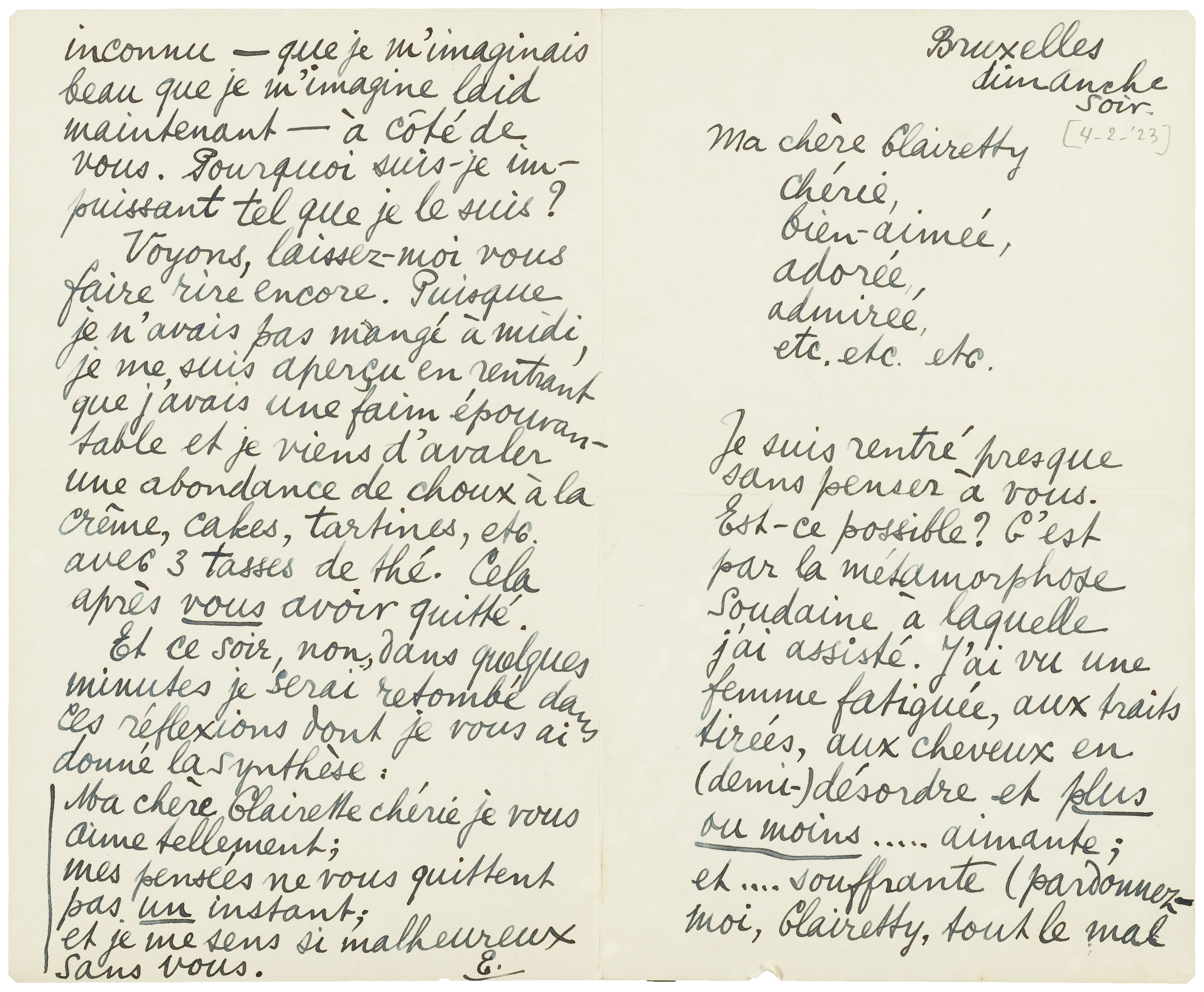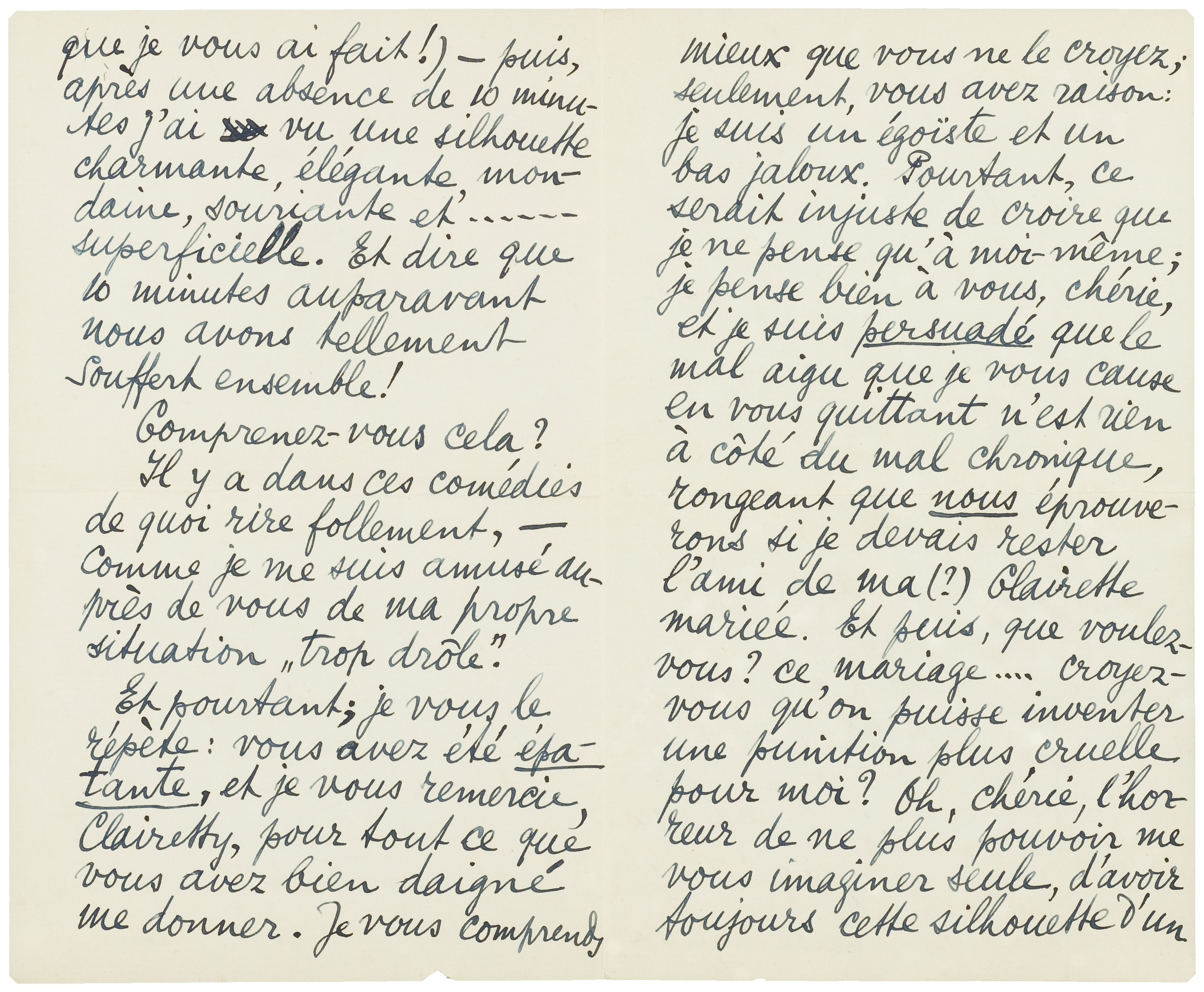 Et pourtant; je vous le répète: vous avez été épatante, et je vous remercie, Clairetty, pour tout ce que vous avez bien daigné me donner. Je vous comprends mieux que vous ne le croyez; seulement, vous avez raison: je suis un égoïste et un bas jaloux. Pourtant, ce serait injuste de croire que je ne pense qu'à moi-même; je pense bien à vous, chérie, et je suis persuadé que le mal aigu que je vous cause en vous quittant n'est rien à côté du mal chronique, rongeant que nous éprouverons si je devais rester l'ami de ma (?) Clairette mariée. Et puis, que voulez-vous? ce mariage.... croyez-vous qu'on puisse inventer une punition plus cruelle pour moi? Oh, chérie, l'horreur de ne plus pouvoir me vous imaginer seule, d'avoir toujours cette silhouette d'un inconnu - que je m'imaginais beau que je m'imagine laid maintenant - à côté de vous. Pourquoi suis-je impuissant tel que je le suis?