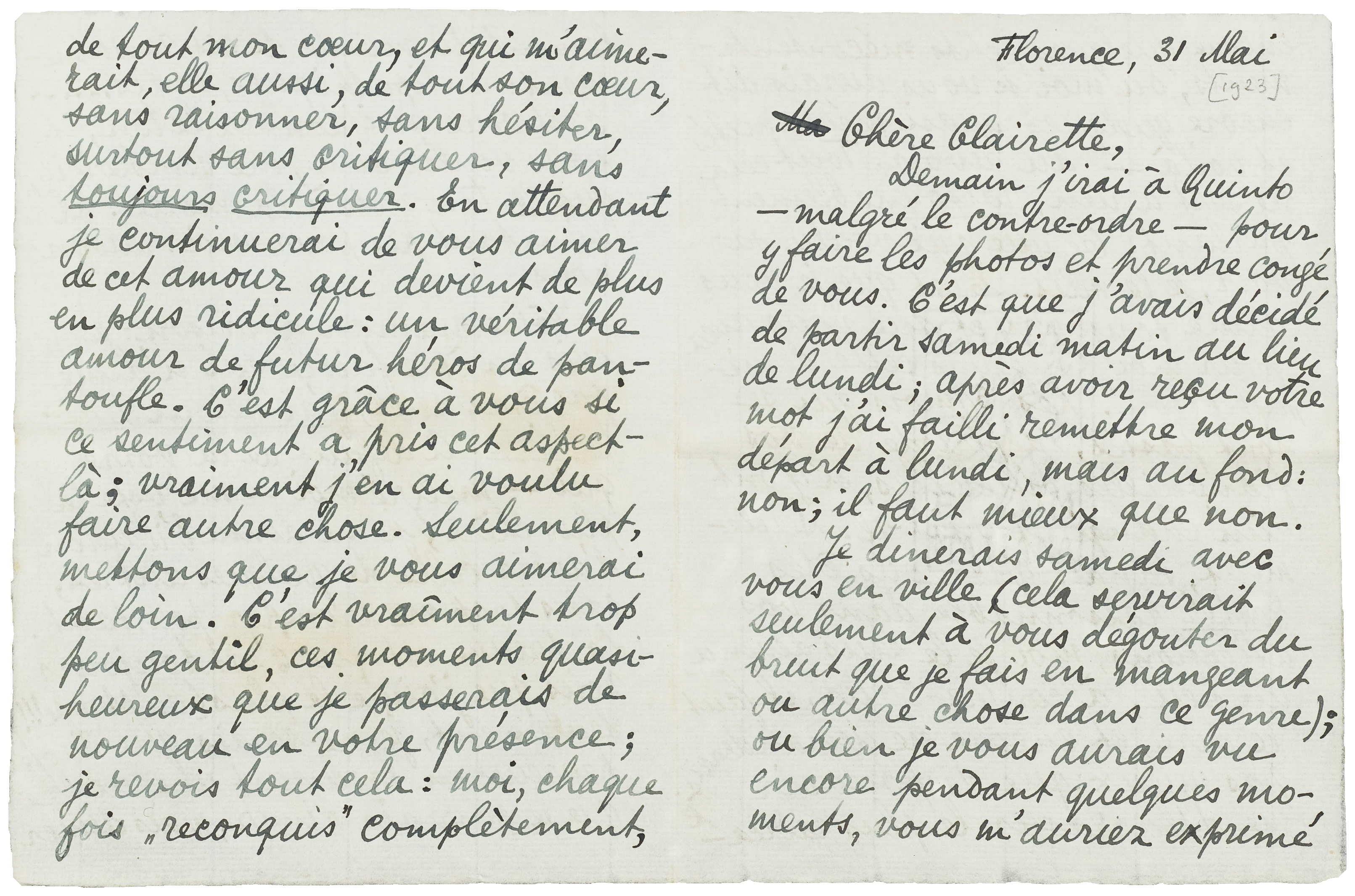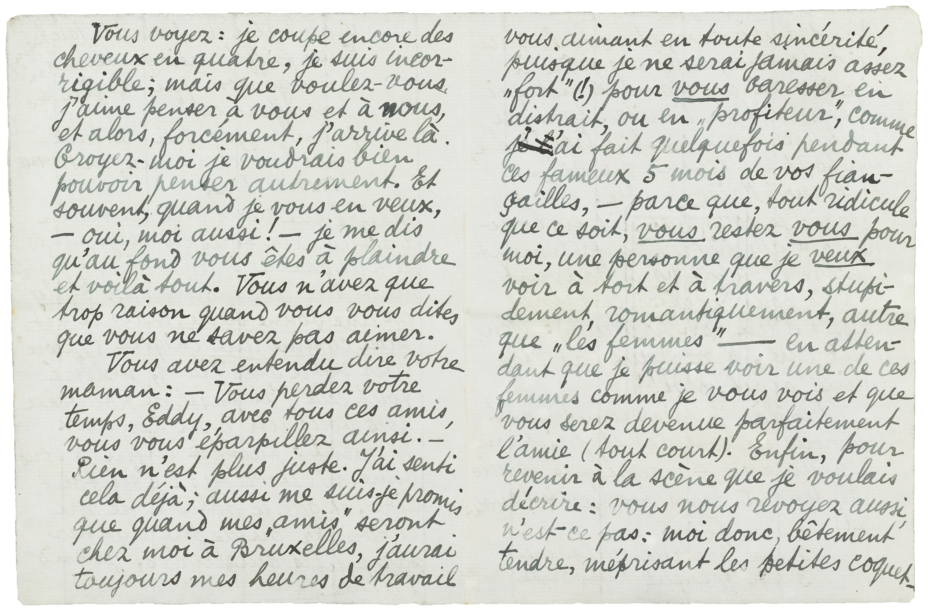 Votre maman a raison: je suis un être faible qui n'aime pas être seul, j'ai besoin d'affection. A défaut de la vôtre qui - malgré moi - me reste la plus chère, je me donne l'illusion d'avoir celle de quelques autres, sans trop me tromper pourtant. La preuve est que c'est toujours vous que j'aime le plus (au Monde!!!) Seulement, je ne serais que trop heureux en trouvant une autre que je pourrais aimer, mais aimer de tout mon coeur, et qui m'aimerait, elle aussi, de tout son coeur, sans raisonner, sans hésiter, surtout sans critiquer, sans toujours critiquer. En attendant je continuerai de vous aimer de cet amour qui devient de plus en plus ridicule: un véritable amour de futur héros de pantoufle. C'est grâce à vous si ce sentiment a pris cet aspect-là; vraiment j'en ai voulu faire autre chose. Seulement, mettons que je vous aimerai de loin. C'est vraîment trop peu gentil, ces moments quasi-heureux que je passerais de nouveau en votre présence; je revois tout cela: moi, chaque fois ‘reconquis’ complètement, vous aimant en toute sincérité, puisque je ne serai jamais assez ‘fort’ (!) pour vous caresser en distrait, ou en ‘profiteur’, comme j'ai fait quelquefois pendant ces fameux 5 mois de vos fiançailles, - parce que, tout ridicule que ce soit, vous restez vous pour moi, une personne que je veux voir à tort et à travers, stupidement, romantiquement, autre que ‘les femmes’ - en attendant que je puisse voir une de ces femmes comme je vous vois et que vous serez devenue parfaitement l'amie (tout court). Enfin, pour revenir à la scène que je voulais d écrire: vous nous revoyez aussi, n'est-ce pas: moi donc, bêtement tendre, méprisant les petites coquetteries d'amoureux, et vous le plus froide possible, toujours prête à dire ‘non’ au moindre mot qui dépasserait la limite, tout au plus une amie un peu trop tendre, un tout petit peu, ou bien: la Fiancée Raisonnable. Non, merci; je vous l'ai dit en badinant, mais j'étais parfaitement sincère (comme vous souvent quand vous me dites certaines choses d'un ton railleur): ‘Non, MaDame, je ne veux pas être “aimé” ainsi, moi!’