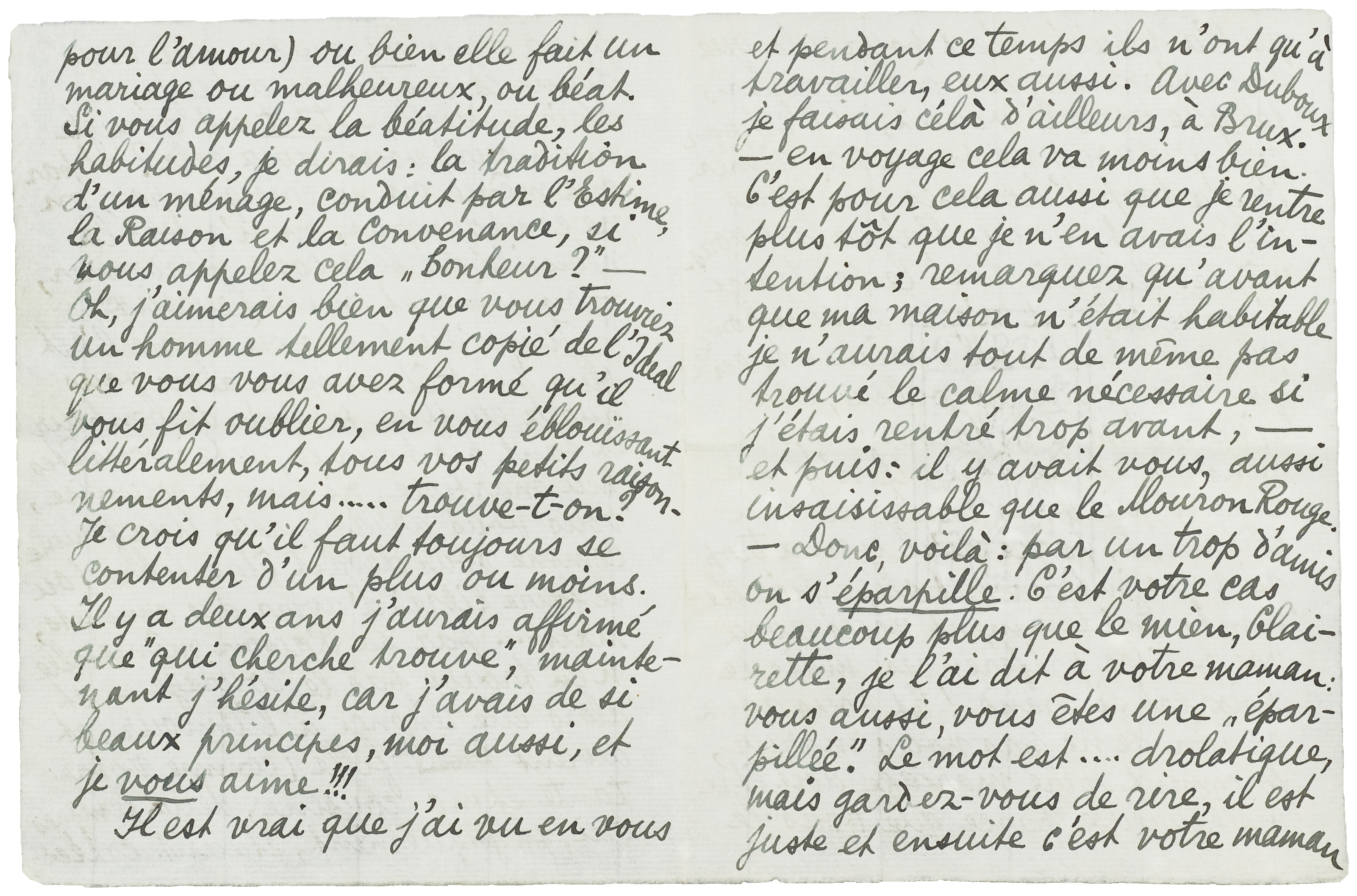Vous avez entendu dire votre maman: - Vous perdez votre temps, Eddy, avec tous ces amis, vous vous éparpillez ainsi. - Rien n'est plus juste. J'ai senti cela déjà; aussi me suis-je promis que quand mes ‘amis’ seront chez moi à Bruxelles, j'aurai toujours mes heures de travail et pendant ce temps ils n'ont qu'à travailler, eux aussi. Avec Duboux je faisais celà d'ailleurs, à Brux. - en voyage cela va moins bien. C'est pour cela aussi que je rentre plus tôt que je n'en avais l'intention; remarquez qu'avant que ma maison n'était habitable je n'aurais tout de même pas trouvé le calme nécessaire si j'étais rentré trop avant, - et puis: il y avait vous, aussi insaisissable que le Mouron Rouge. - Donc, voilà: par un trop d'amis on s'éparpille. C'est votre cas beaucoup plus que le mien, Clairette, je l'ai dit à votre maman: vous aussi, vous êtes une ‘éparpillée’. Le mot est.... drolatique, mais gardez-vous de rire, il est juste et ensuite c'est votre maman qui l'a trouvé. C'est pour cela que vous n'arrivez pas à travailler, tel que vous le voulez, et c'est par cela que vous ne savez pas aimer. Il y a trop d'hommes qui vous intéressent, - vous l'avez dit vous-même. Au fond c'est le contraire d'une vérité: il n'y a aucun homme qui vous intéresse vraiment, en qui vous vous absorbez, car aimer c'est s'absorber un peu dans un autre être, il n'y en a aucun qui vous intéresse complètement, parce qu'il y en a trop qui vous intéressent superficiellement. Evidemment vous avez vos petites préférences, mais le choix est si grand! Et vous avez raison de ne pas vous marier, forcément votre mariage doit être malheureux, parce que vous le feriez sans cet amour qui vous donne la confiance aveugle, le désir aveugle, - tout est aveugle en amour, vous savez cela? et par cela même on ne critique pas, on ne compare pas, on n'a pas la nécessité de beaucoup pardonner, - on aime, et on est heureux.