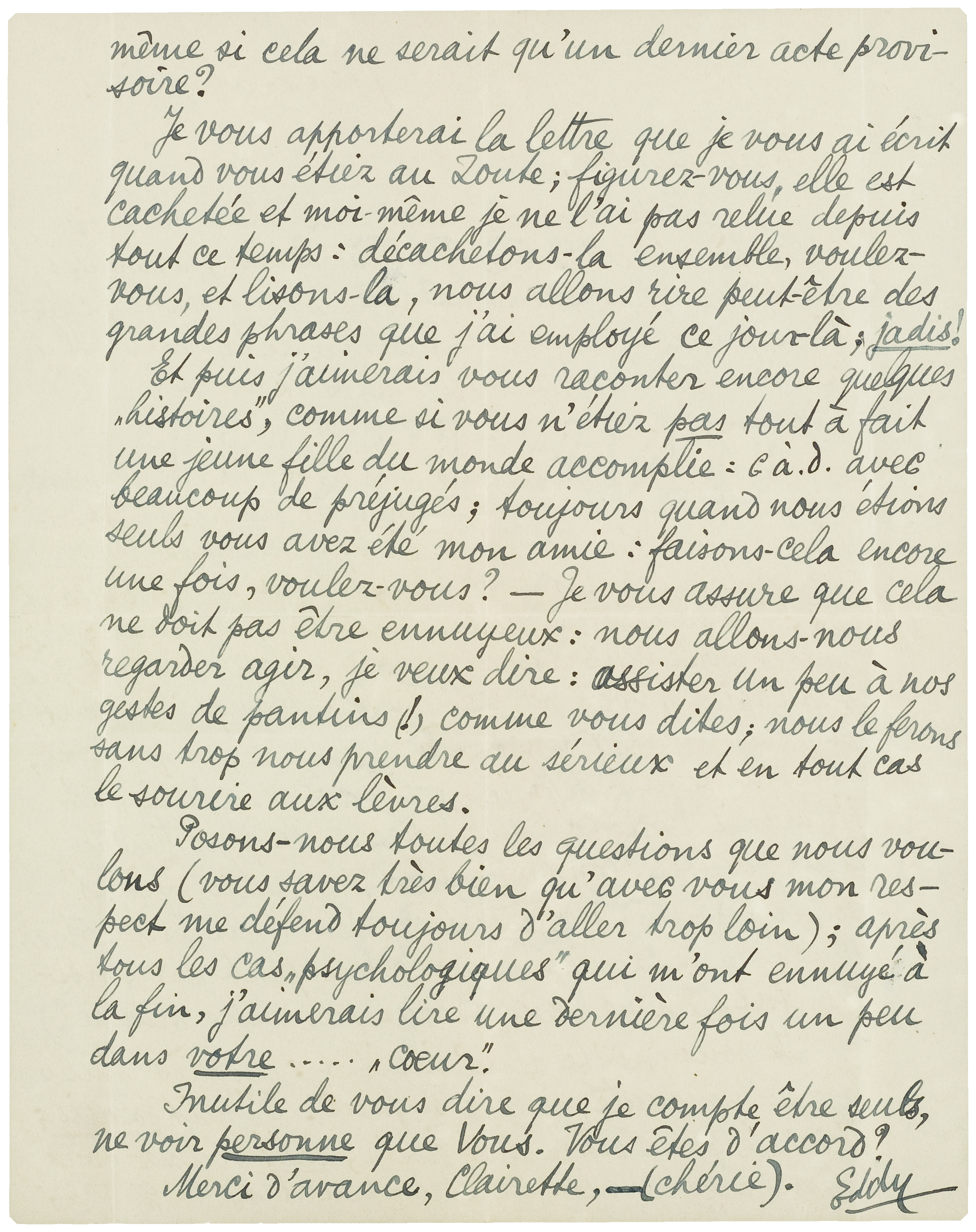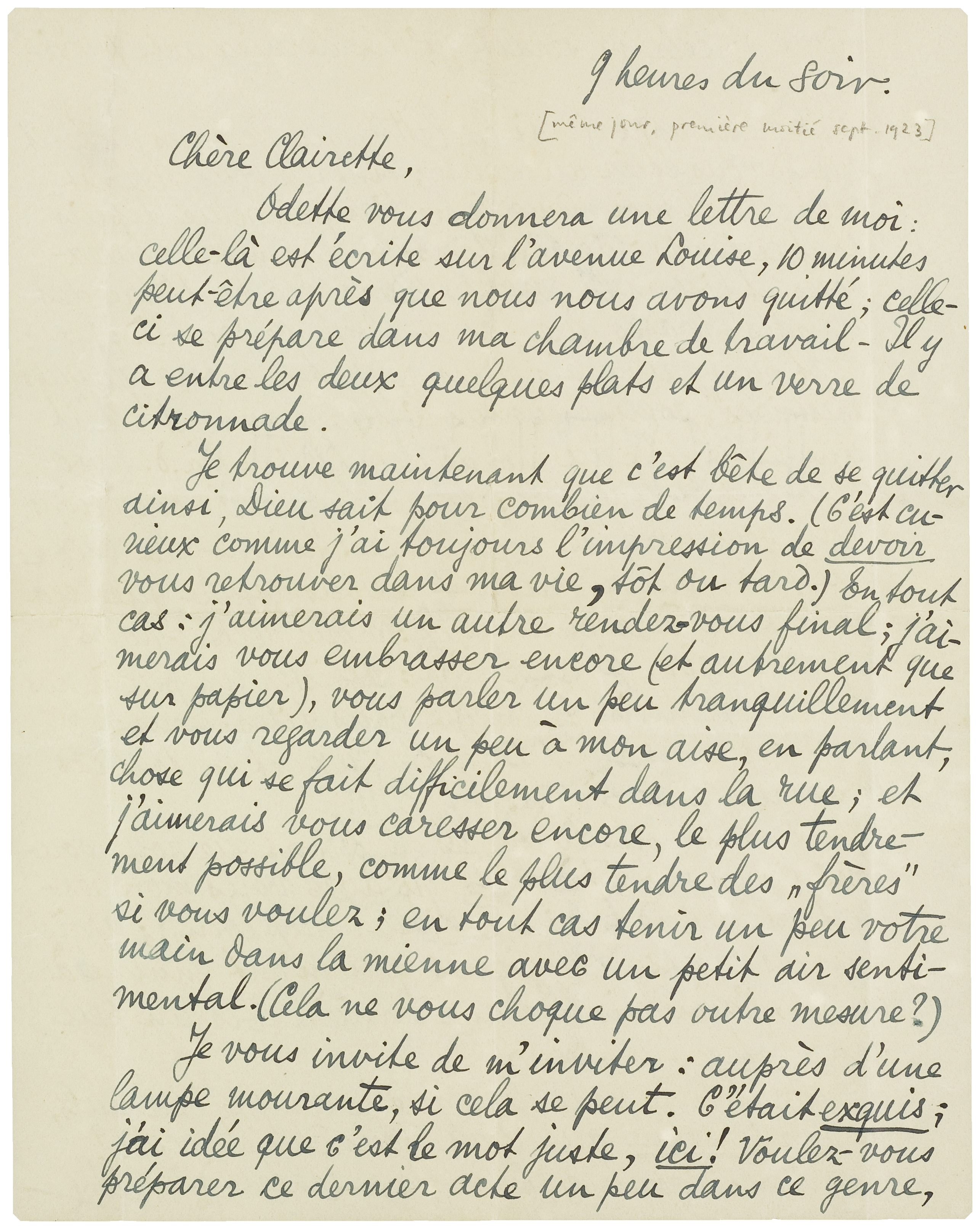 Je trouve maintenant que c'est bête de se quitter ainsi, Dieu sait pour combien de temps. (C'est curieux comme j'ai toujours l'impression de devoir vous retrouver dans ma vie, tôt ou tard.) En tout cas: j'aimerais un autre rendez-vous final; j'aimerais vous embrasser encore (et autrement que sur papier), vous parler un peu tranquillement et vous regarder un peu à mon aise, en parlant, chose qui se fait difficilement dans la rue; et j'aimerais vous caresser encore, le plus tendrement possible, comme le plus tendre des ‘frères’ si vous voulez; en tout cas tenir un peu votre main dans la mienne avec un petit air sentimental. (Cela ne vous choque pas outre mesure?)