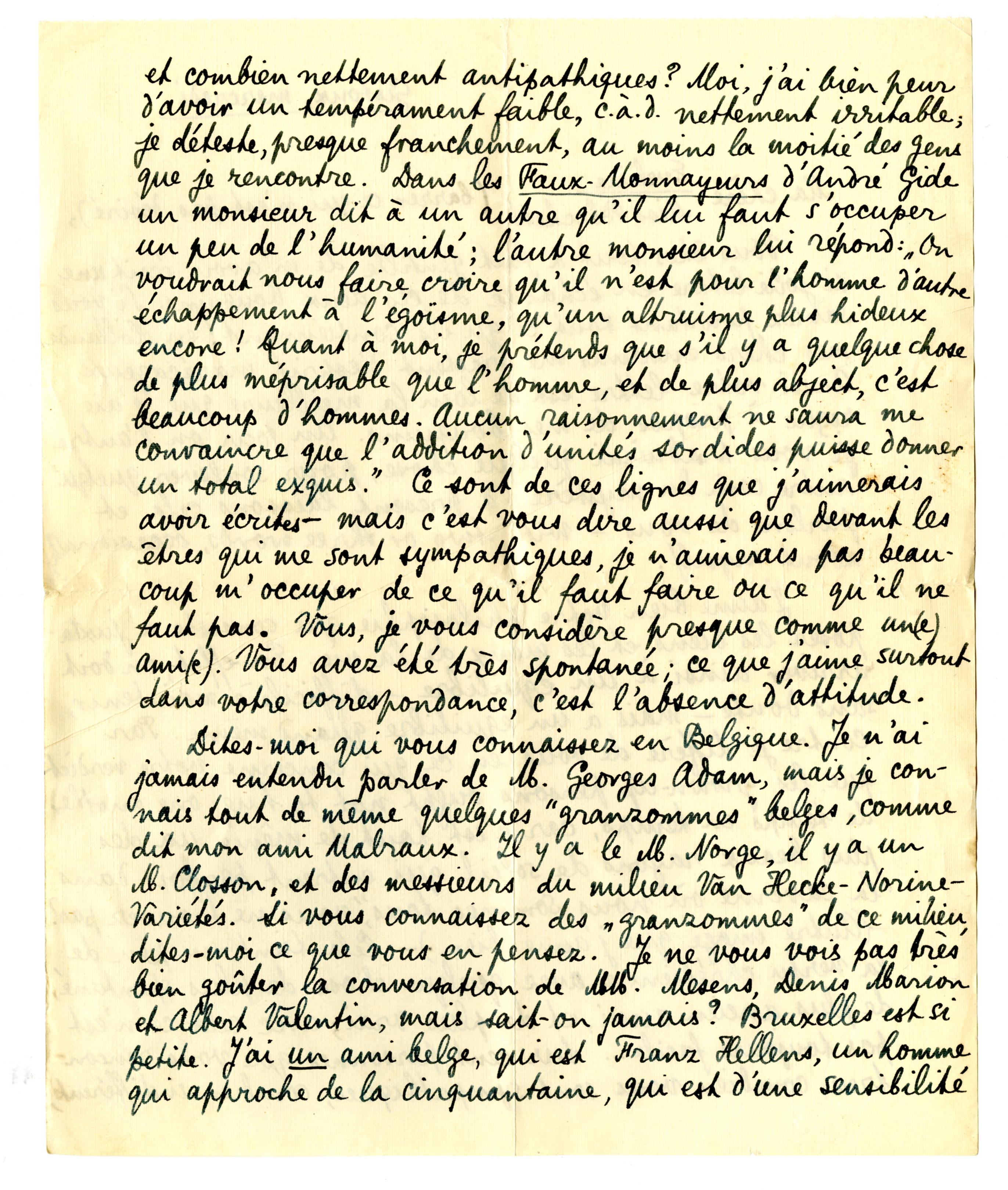 Dites-moi qui vous connaissez en Belgique. Je n'ai jamais entendu parler de M. Georges Adam, mais je connais tout de même quelques ‘granzommes’ belges, comme dit mon ami Malraux. Il y a le M. Norge, il y a un M. Closson, et des messieurs du milieu Van Hecke-Norine-Variétés. Si vous connaissez des ‘granzommes’ de ce milieu, dites-moi ce que vous en pensez. Je ne vous vois pas très bien goûter la conversation de MM. Mesens, Denis Marion et Albert Valentin, mais sait-on jamais? Bruxelles est si petite. J'ai un ami belge, qui est Franz Hellens, un homme qui approche de la cinquantaine, qui est d'une sensibilité très grande et qui a souvent des naïvetés d'enfant, Je vous le ferai connaître quand vous serez à Bruxelles, et si vous le désirez. - Autre petit projet, puisque c'est si facile d'en faire: qu'en penseriez-vous si je venais en Angleterre au prochain printemps avec Slauerhoff qui, lui aussi, aimerait beaucoup y aller? Slauerhoff est un drôle de coco, mais je pense que vous le trouverez dans l'ensemble très sympathique. Il est plutôt négligé, désordonné, malhabile, mais très bon et d'une grande intelligence intérieure qui vaut des sacs de propos brillants.