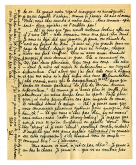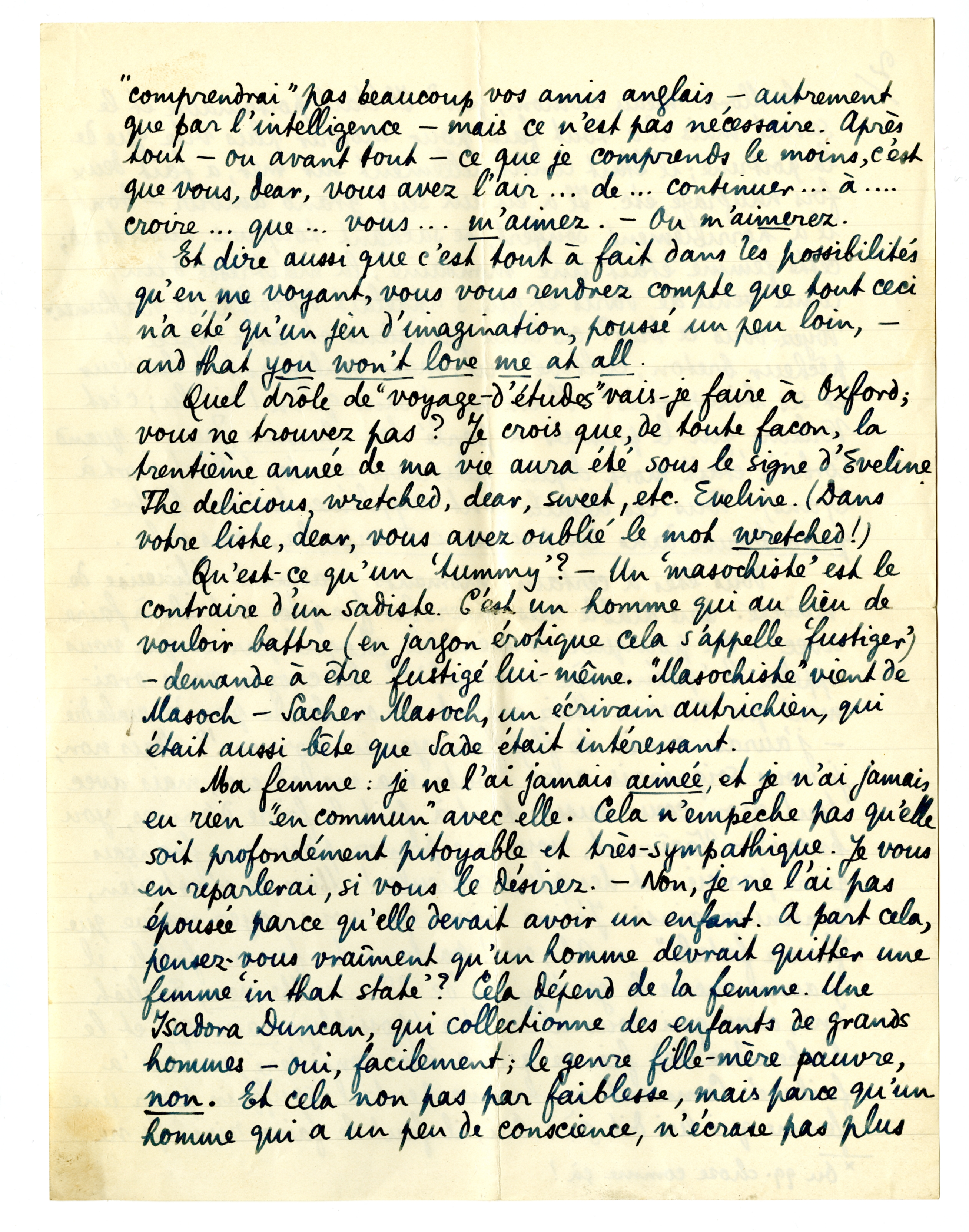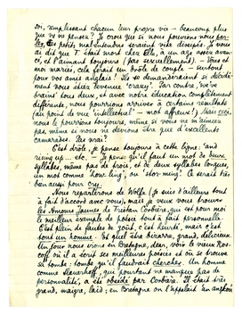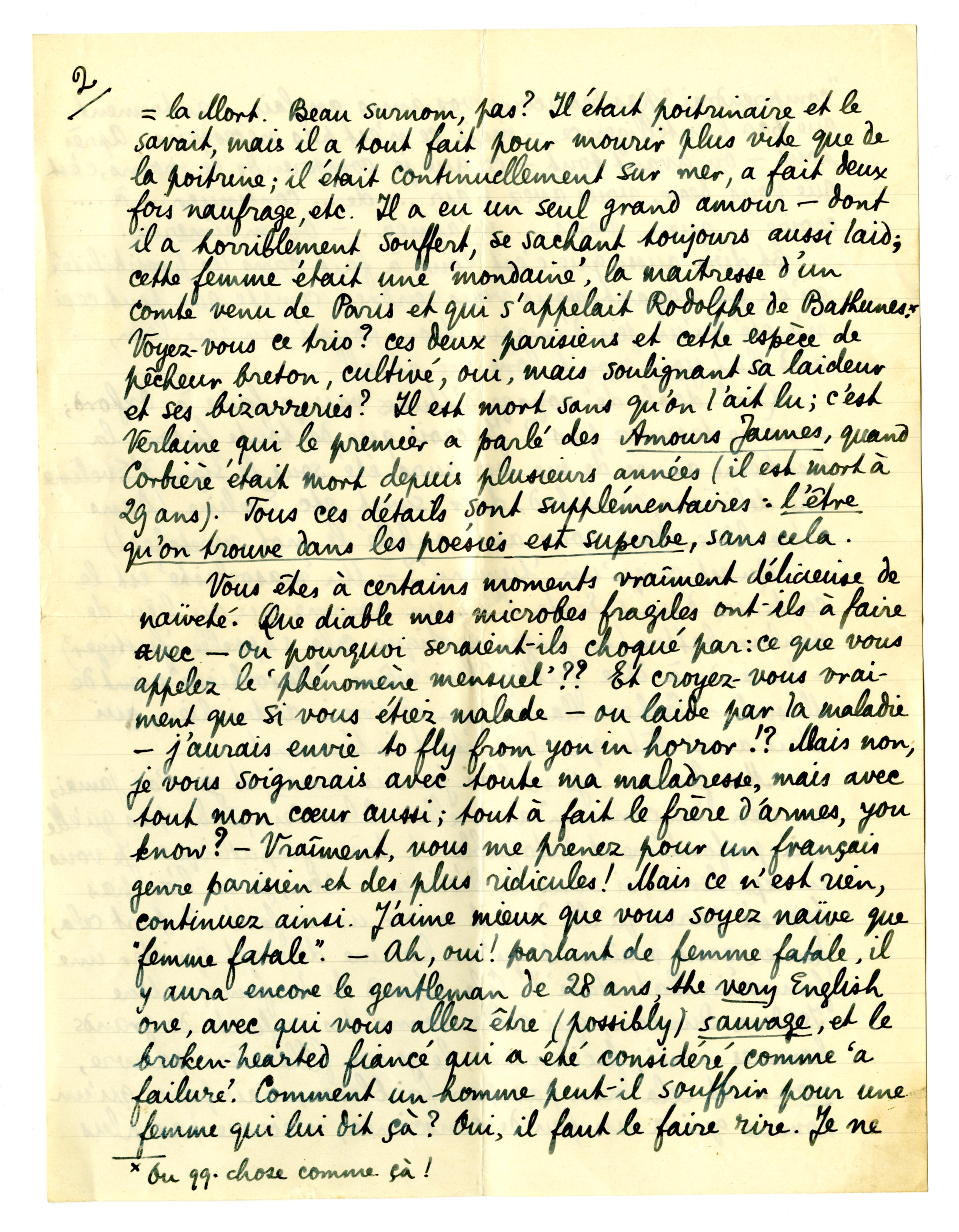 Vous êtes à certains moments vraiment délicieuse de naïveté. Que diable mes microbes fragiles ont-ils à faire avec - ou pourquoi seraient-ils choqué par: ce que vous appelez le ‘phénomène mensuel’?? Et croyez-vous vraiment que si vous étiez malade - ou laide par la maladie - j'aurais envie to fly from you in horror!? Mais non, je vous soignerais avec toute ma maladresse, mais avec tout mon coeur aussi; tout à fait le frère d'armes, you know? - Vraiment, vous me prenez pour un français genre parisien et des plus ridicules! Mais ce n'est rien, continuez ainsi. J'aime mieux que vous soyez naïve que ‘femme fatale’. - Ah, oui! parlant de femme fatale, il y aura encore le gentleman de 28 ans, the very English one, avec qui vous allez être (possibly) sauvage, et le broken-hearted fiancé qui a été considéré comme ‘a failure’. Comment un homme peut‘il souffrir pour une femme qui lui dit ça? Oui, il faut le faire rire. Je ne ‘comprendrai’ pas beaucoup; vos amis anglais - autrement que par l'intelligence - mais ce n'est pas nécessaire. Après tout - ou avant tout - ce que je comprends le moins, c'est que vous, dear, vous avez l'air ... de ... continuer ... à ... croire ... que ... vous ... m'aimez. - Ou m'aimerez.