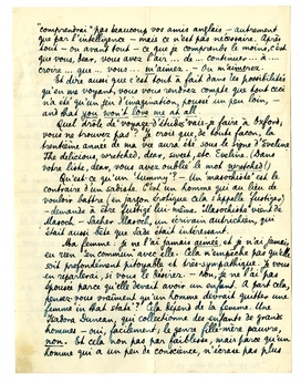 Vous êtes trop chic, pour vous laisser attendre. Je vous écrirai tous les jours; seulement, ne répondez plus. Et d'abord merci de la lettre d'aujourd'hui; vous êtes vraiment très, très bien et vous allez m'obliger à vous aimer éperdument - et après? Imaginez- vous un moment nous deux mariés: quelle drôle de chose - nous, tellement différents, des ‘produits’ absolument opposés, - ou du moins ‘disparates’; et nos enfants, dear, quels drôles d'enfants ils seraient! N'importe, quand vous écrivez ainsi, vous êtes irrésistible et moi - je suis sur le point de comprendre ‘the dark horizons of surrender’! Mais je fais mieux de ne plus écrire de tout cela. S'il me faut repartir d'Oxford précipitamment, pour retrouver ‘old Malraux’, qui est vraiment l'homme le plus admirable que je connaisse, ce serait trop triste, you see?