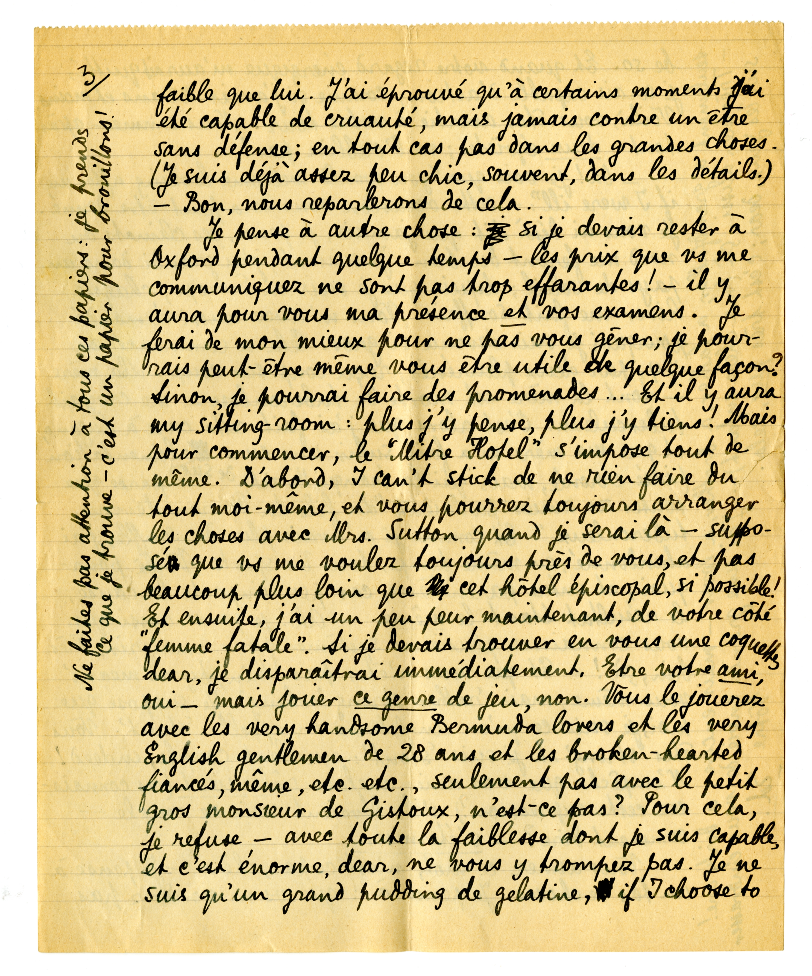 Je pense à autre chose: si je devais rester à Oxford pendant quelque temps - les prix que vs me communiquez ne sont pas trop effrayantes! - il y a aura pour vous ma présence et vos examens. Je ferai de mon mieux pour ne pas vous gêner; je pourrais peut-être même vous être utile de quelque façon? Sinon, je pourrai faire des promenades ... Et il y a aura my sitting-room: plus j'y pense, plus j'y tiens! Mais pour commencer le ‘Mitre Hotel’ s'impose tout de même. D'abord, I can't stick de ne rien faire du tout moi-même, et vous pouvez toujours arranger les choses avec Mrs. Sutton quand je serai là - supposé que vs me voulez toujours près de vous, et pas beaucoup plus loin que cet hôtel épiscopal, si possible! Et ensuite, j'ai un peu peur maintenant, de votre côté ‘femme fatale’. Si je devais trouver en vous une coquette, dear, je disparaîtrai immédiatement. Etre votre ami, oui - mais jouer ce genre de jeu, non. Vous le jouerez avec les very handsome Bermuda lovers et les very English gentlemen de 28 ans et les broken-hearted fiancés, même, etc, etc., seulement pas avec le petit gros monsieur de Gistoux, n'est-ce pas? Pour cela, je refuse - avec toute la faiblesse dont je suis capable, et c'est énorme, dear, ne vous y trompez pas. Je ne suis qu'un grand pudding de gelatine, if I choose to be so. Et quand votre regard énergique m'aurait quitté, je serais capable d'action, comme si j'avais 22 ans et moins. Voilà, vous êtes avertie à votre tour. Nous sommes - après tout - deux égoïstes; ne l'oubliez pas!