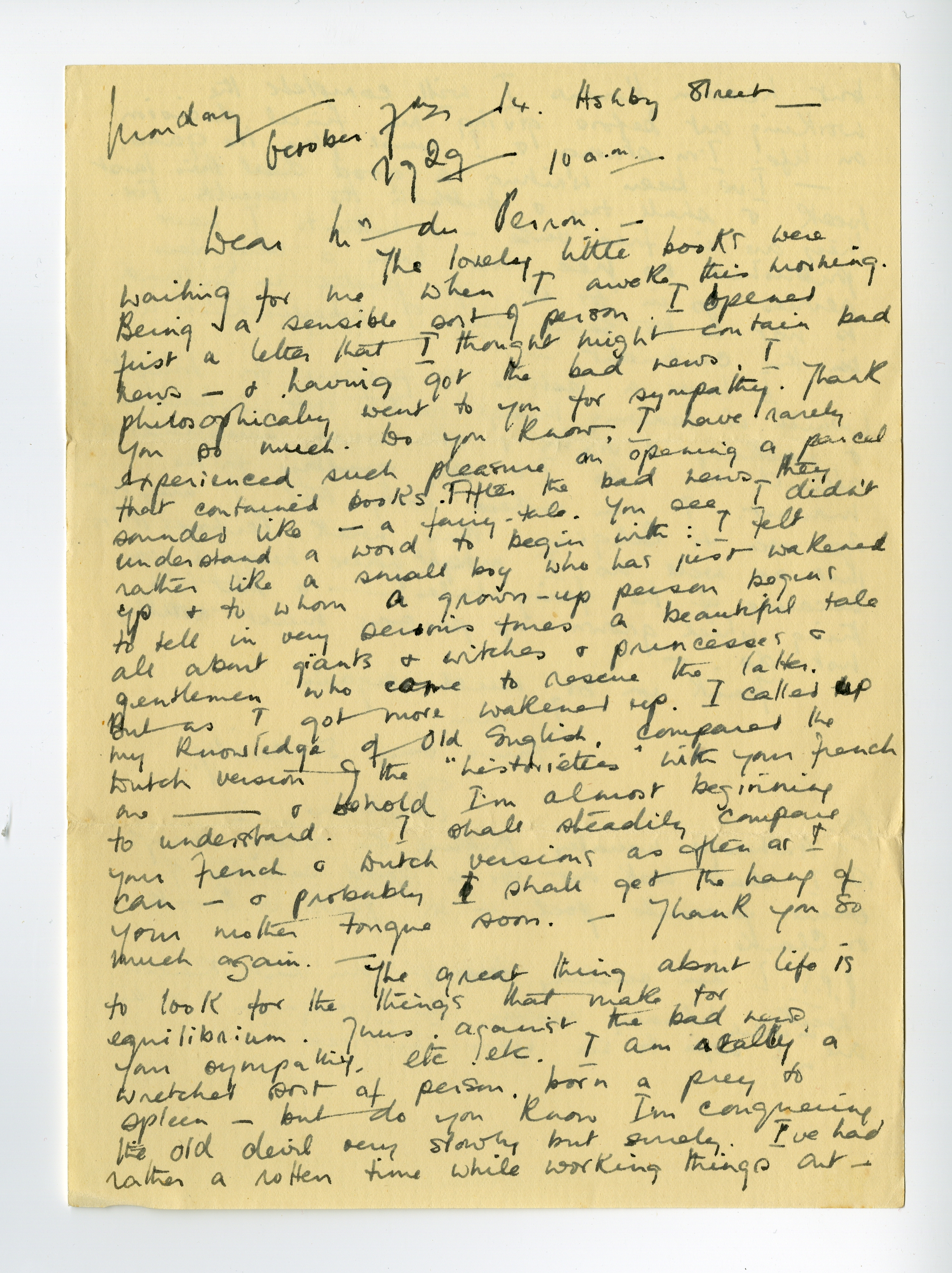 The lovely little books were waiting for me when I awoke this morning. Being a sensible sort of person I opened first a letter that I thought might contain bad news - & having got the bad news, I philosophically went to you for sympathy. Thank you so much. Do you know, I have rarely experienced such pleasure on opening a parcel that contained books. After the bad news they sounded like - a fairy-tale. You see I didn't understand a word to begin with: I felt rather like a small boy who has just wakened up & to whom a grown-up person begins to tell in very serious tones a beautiful tale all about giants & witches & princesses & gentlemen who come to rescue the latter. But as I got more wakened up, I called up my knowledge of Old English, compared the Dutch version of the ‘historiettes’ with your French one - & behold I'm almost beginning to understand. I shall steadily compare your French & Dutch versions as often as I can - & probably I shall get the hang of your mother tongue soon. - Thank you so much again. -