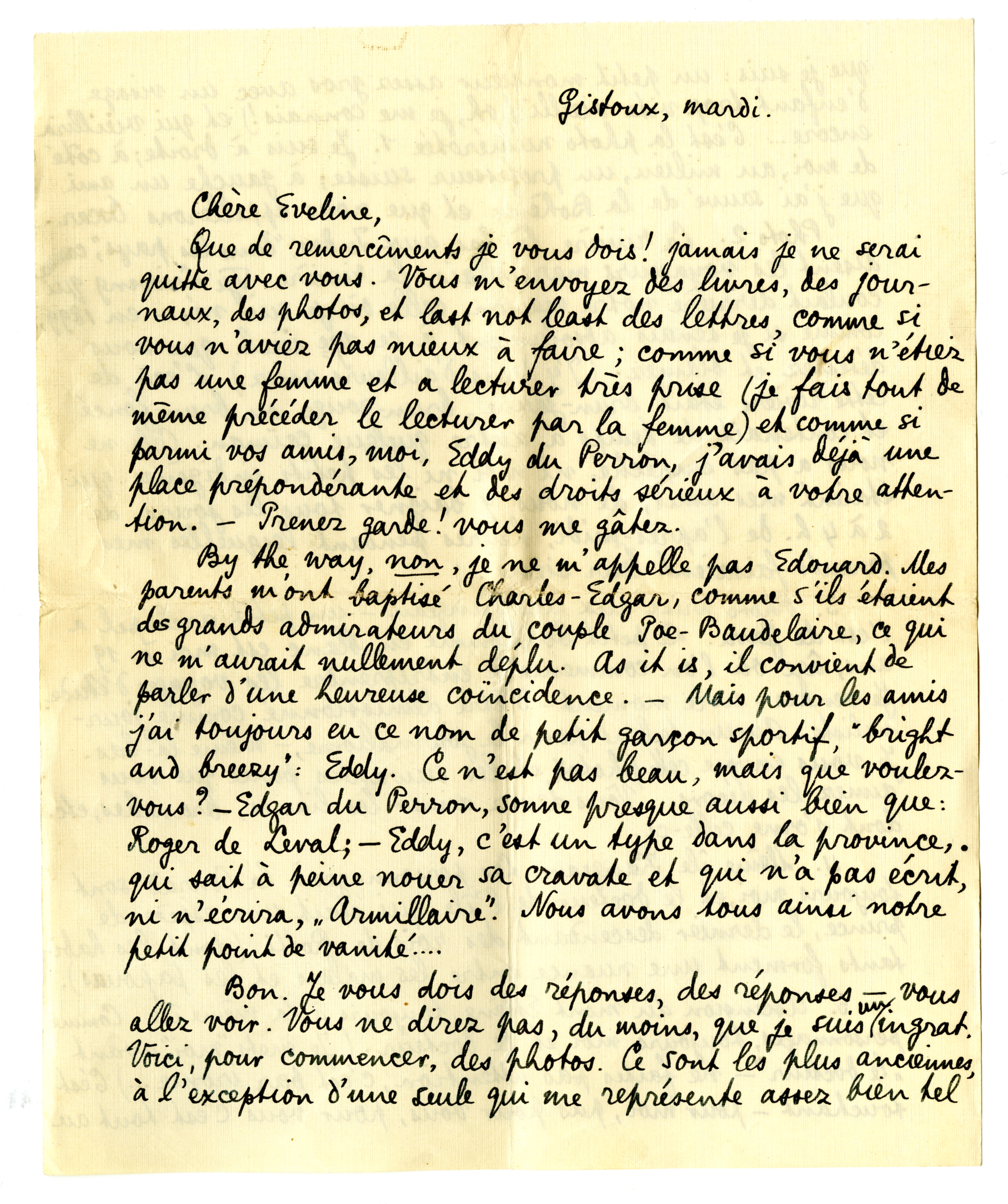 By the way, non, je ne m'appelle pas Edouard. Mes parents m'ont baptisé Charles-Edgar, comme s'ils étaient des grands amateurs du couple Poe-Baudelaire, ce qui me n'aurait nullement déplu. As it is, il convient de parler d'une heureux coïncidence. - Mais pur les amis j'ai toujours eu ce nom de petit garçon sportif, ‘bright and breezy’: Eddy. Ce n'est pas beau, mais que voulez-vous? - Edgar du Perron, sonne presque aussi bien que: Roger de Leval; - Eddy, c'est un type dans la province, qui sait à peine nouer sa cravate et qui n'a pas écrit, ni n'écrira ‘Armillaire’. Nous avons tous ainsi notre petit point de vanité....