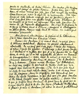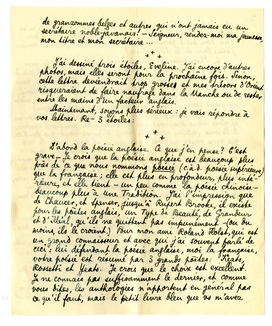 J'aimerais beaucoup lire Yeats, Brooke, Masefield, Walter de la Mare, Ernest Dowson. - Qui est Clarke, dont vous me parlez? Il ne figure pas dans le petit livre bleue. - En attendant, les poètes que je relis sont ceux qui en tant qu'homme me sont chers: Baudelaire, Rimbaud, Tristan Corbière, Jarry, Apollinaire. (Quand je dis Rimbaud, je ne parle pas des Illuminations, mais des vers réguliers; les Illuminations ont trop servi à justifier l'effort d'un tas de nullités à paraître mystérieux et éloquents, là où ils n'avaient absolument rien à dire.) Vous allez faire la grimace - non? ‘ tous ces messieurs sortent du détesté 19e! Mais tranquillisez-vous: j'aime, non moins que ceux-ci, Villon, et Ronsard, et même une partie de Malherbe, et André Chénier. Par contre, j'ai toujours vainement essayé de goûter Racine. Je sais bien que c'est beau, et même mieux que cela, que c'est rempli des meilleures choses humaines, mais ce style-là m'incommode. Cette régularité, et cette cadence mesurée qui ne pardonne jamais - c'est trop fort pour mes faibles nerfs, je crois. D'ailleurs, je me console; si je veux me retremper dans cette grandeur humaine-là, je reprends Shakespeare. Ici, c'est le contraire de ce que je vs disais tout à l'heure; comparé à Shakespeare en plein force, Racine reste tout de même: un intelligent monsieur pommadé.