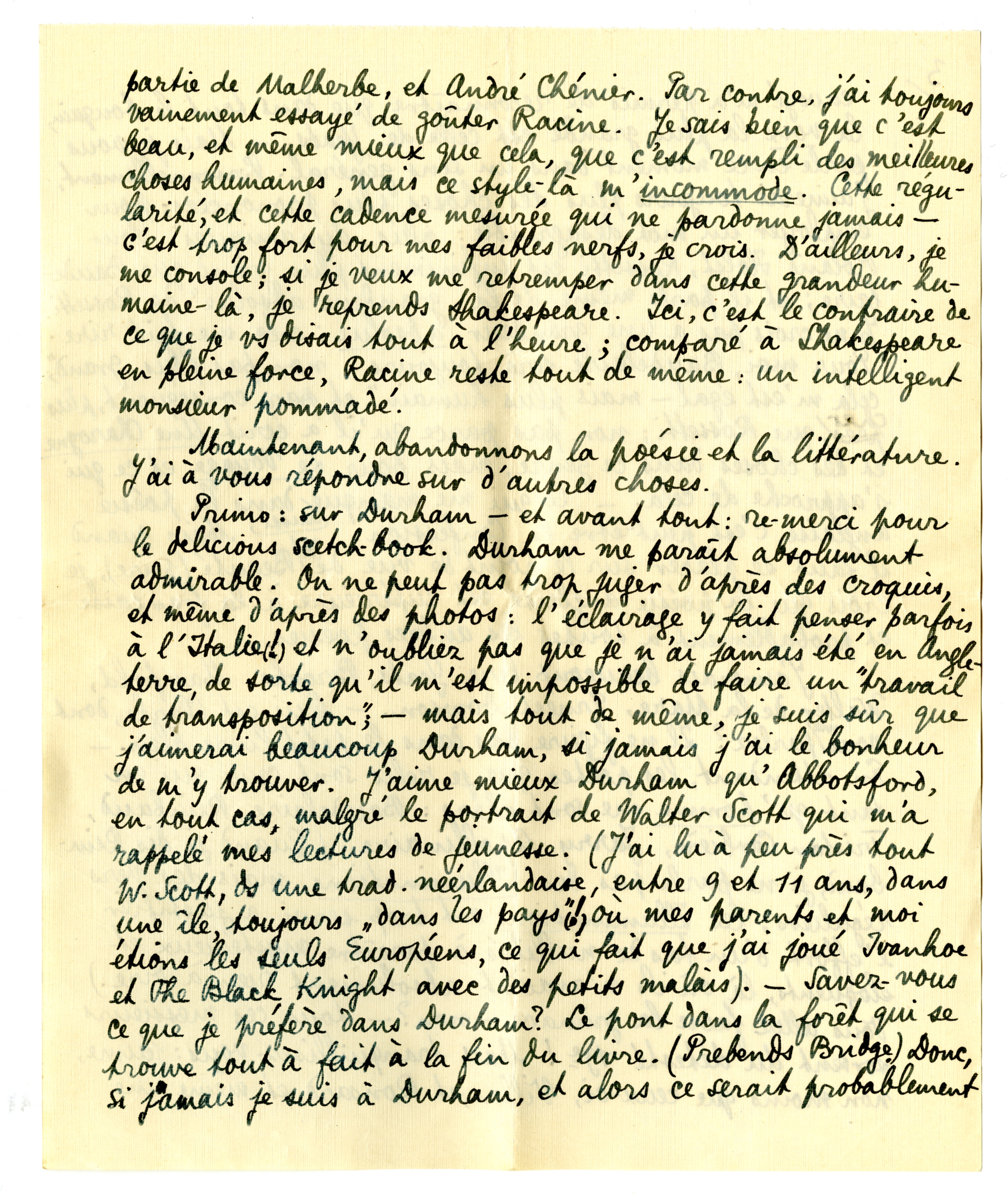 Primo: sur Durham - et avant tout: re-merci pour le delicious scetch-book. Durham me paraît absolument admirable. On ne peut pas trop juger d'après des croquis, et même après des photos: l'éclairage y fait penser parfois à l'Italie (!) et n'oubliez-pas que je n'ai jamais été en Angleterre, de sorte qu'il m'est impossible de faire un ‘travail de transposition’; - mais tout de même, je suis sûr que j'aimerais beaucoup Durham, si jamais j'ai le bonheur de m'y trouver. J'aime mieux Durham qu'Abbotsford, en tout cas, malgré le portrait de Walter Scott qui m'a rappelé mes lectures de jeunesse. (J'ai lu à peu près tout W. Scott, ds une traduction neérlandaise, entre 9 et 11 ans, dans une île toujours ‘dans les pays’(!) où mes parents et moi étaient les seuls Européens, ce qui fait que j'ai joué Ivanhoe et The Black Knight avec des petits malais). - Savez-vous ce que je préfère dans Durham? Le pont dans la forêt qui se trouve tout à fait à la fin du livre. (Prebends Bridge.) Donc, si jamais je suis à Durham, et alors ce serait probablement avec vous, j'aimerais faire une photo de vous, là. Retenons-ceci. - Mais je ne me vois pas très bien parcourant l'Angleterre à vos côtés. Croyez-vous que vous trouveriez cela bien drôle de quitter vos conférences, vos amis mondains et savants (your learned and your society friends). pour montrer Oxford, ou Durham, à un petit gros monsieur surgi de Dieu sait quelles campagnes? Je n'ai plus la naïveté d'y croire. Je trouve déjà très étonnant que vous ayez trouvé le temps de m'écrire tant et si régulièrement mais jusqu'ici j'ai profité de l'anonymat, sans doute.