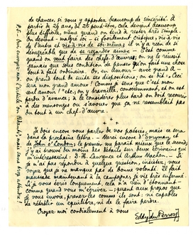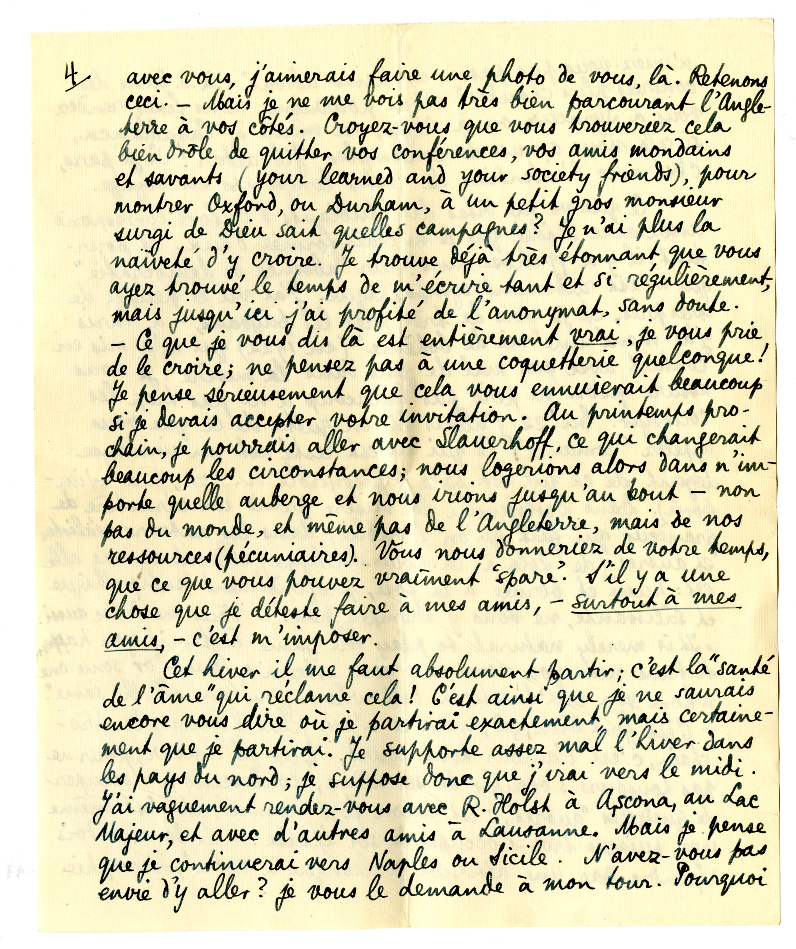 - Ce que je vous dis là est entièrement vrai, je vous prie de le croire; ne pensez pas à une coquetterie quelconque! Je pense sérieusement que cela vous ennuierait beaucoup si je devais accepter votre invitation. Au printemps prochain, je pourrais aller avec Slauerhoff, ce qui changerait beaucoup les circonstances; nous logerions alors dans n'importe quelle auberge et nous irions jusqu'au bout - non pas du monde, et même pas de l'Angleterre, mais de nos ressources (pécuniaires). Vous nous donneriez de votre temps, ce que vous pouver vraiment ‘spare’. S'il y a une chose que je déteste faire à mes amis, - surtout à mes amis c'est m'imposer.